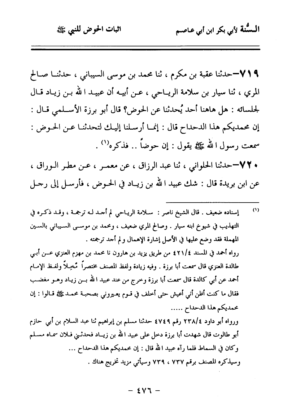 719 - حَدَّثنا عُقْبَةُ بْنُ مُكْرَمٍ، حَدَّثنا مُحَمَّدُ بْنُ مُوسَى السَّيْبَانِيُّ، حَدَّثنا صَالِحٌ الْمُرِّيُّ، حَدَّثنا سَيَّارُ بْنُ سَلاَمَةَ الرِّيَاحِيُّ، عَنْ أَبِيهِ، أَنَّ عُبَيْدَ اللهِ بْنَ زِيَادٍ قَالَ لِجُلَسَائِهِ: هَلْ هَاهُنَا أَحَدٌ يُحَدِّثُنَا عَنِ الْحَوْضِ؟ قَالَ أَبُو بَرْزَةَ الأَسْلَمِيُّ: قَالَ: إِنَّ مُحَمَّدِيَّكُمْ هَذَا الدَّحْدَاحُ، قَالَ: إِنَّمَا أَرْسَلْنَا إِلَيْكَ لِتُحَدِّثَنَا عَنِ الْحَوْضِ، سَمِعْتُ رَسُولَ اللهِ صَلى الله عَلَيهِ وسَلمَ يَقُولُ: إِنَّ حَوْضًا، فَذَكَرَهُ.