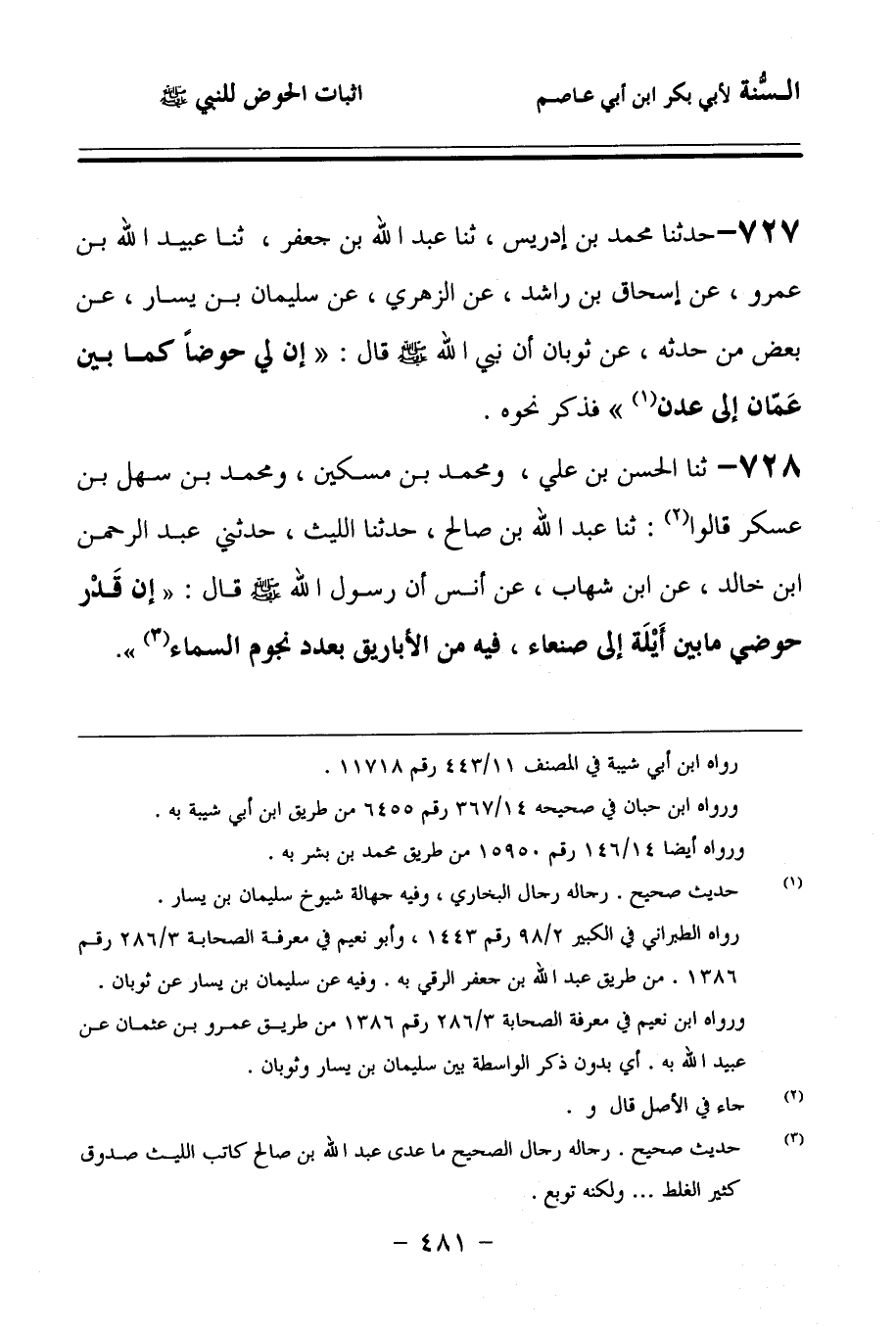 728 - حَدَّثنا الْحَسَنُ بْنُ عَلِيٍّ، وَمُحَمَّدُ بْنُ مِسْكِينٍ، وَمُحَمَّدُ بْنُ سَهْلِ بْنِ عَسْكَرٍ، قَالُوا: حَدَّثنا عَبْدُ اللهِ بْنُ صَالِحٍ، حَدَّثنا اللَّيْثُ، حَدَّثَنِي عَبْدُ الرَّحْمَنِ بْنُ خَالِدٍ، عَنِ ابْنِ شِهَابٍ، عَنْ أَنَسٍ، أَنَّ رَسُولَ اللهِ صَلى الله عَلَيهِ وسَلمَ قَالَ: إِنَّ قَدْرَ حَوْضِي مَا بَيْنَ أَيْلَةَ إِلَى صَنْعَاءَ، فِيهِ مِنَ الأَبَارِيقِ بِعَدَدِ نُجُومِ السَّمَاءِ.