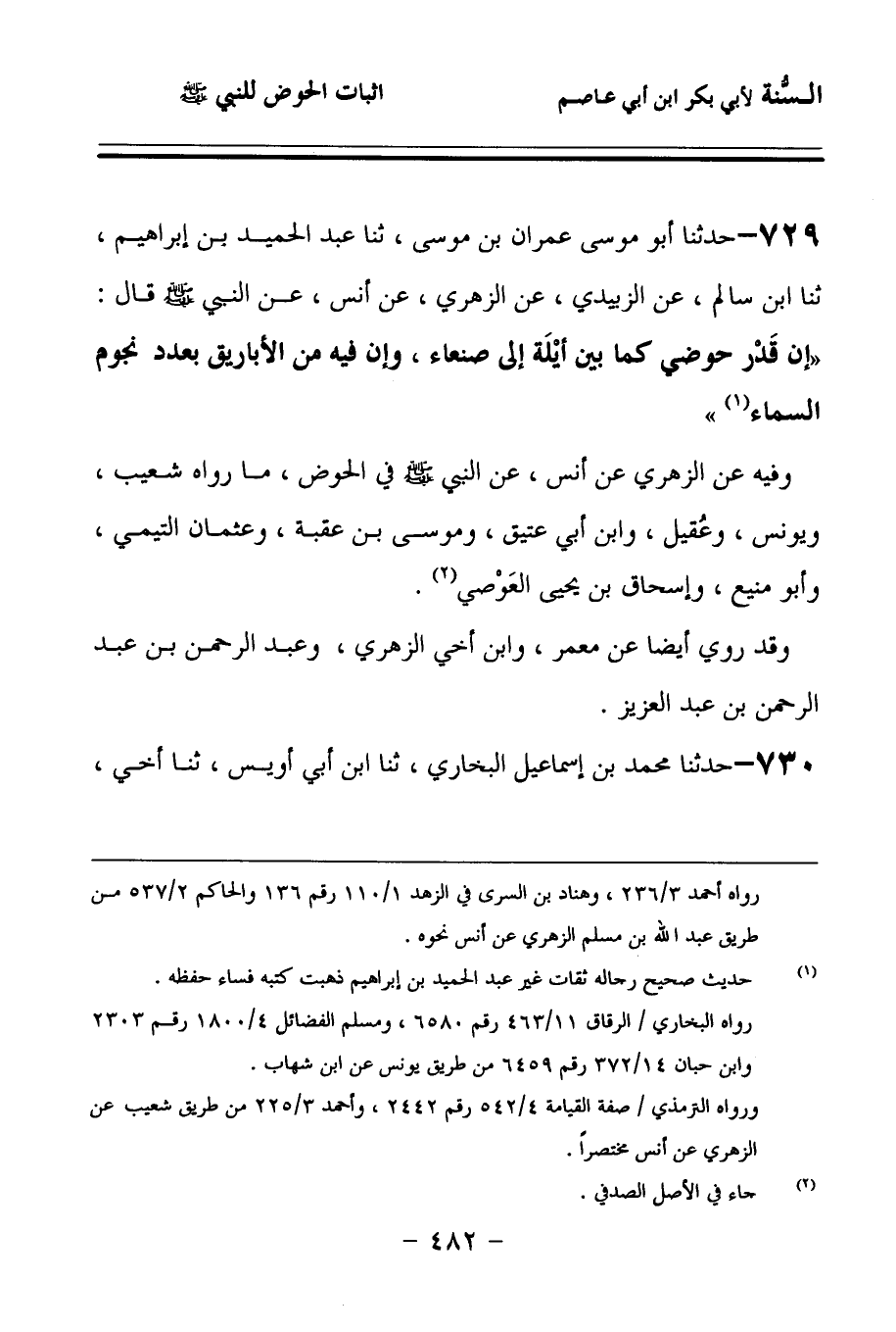 729 - حَدَّثنا أَبُو مُوسَى عِمْرَانُ بْنُ مُوسَى، حَدَّثنا عَبْدُ الْحَمِيدِ بْنُ إِبْرَاهِيمَ، حَدَّثنا ابْنُ سَالِمٍ، عَنِ الزُّبَيْدِيِّ، عَنِ الزُّهْرِيِّ، عَنْ أَنَسٍ، عَنِ النَّبِيِّ صَلى الله عَلَيهِ وسَلمَ قَالَ: إِنَّ قَدْرَ حَوْضِي كَمَا بَيْنَ أَيْلَةَ إِلَى صَنْعَاءَ، وَإِنَّ فِيهِ مِنَ الأَبَارِيقِ بِعَدَدِ نُجُومِ السَّمَاءِ.