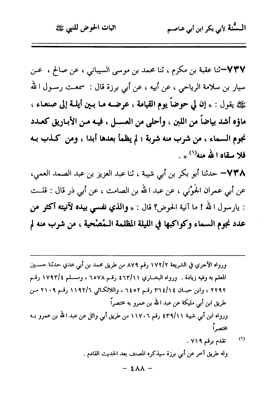 738 - حَدَّثنا أَبُو بَكْرِ بْنُ أَبِي شَيْبَةَ، حَدَّثنا عَبْدُ الْعَزِيزِ بْنُ عَبْدِ الصَّمَدِ الْعَمِّيُّ، عَنْ أَبِي عِمْرَانَ الْجَوْنِيِّ، عَنْ عَبْدِ اللهِ بْنِ الصَّامِتِ، عَنْ أَبِي ذَرٍّ، قَالَ: قُلْتُ: يَا رَسُولَ اللهِ, مَا آنِيَةُ الْحَوْضِ؟ قَالَ: وَالَّذِي نَفْسِي بِيَدِهِ، لَآنِيَتُهُ أَكْثَرُ مِنْ عَدَدِ نُجُومِ السَّمَاءِ وَكَوَاكِبِهَا فِي اللَّيْلَةِ الْمُظْلِمَةِ الْمُصْحِيَةِ، مَنْ شَرِبَ مِنْهُ لَمْ يَظْمَأْ، عَرْضُهُ مِثْلُ طُولِهِ، مَا بَيْنَ عُمَانَ إِلَى أَيْلَةَ، مَاؤُهُ أَشَدُّ بَيَاضًا مِنَ اللَّبَنِ، وَأَحْلَى مِنَ الْعَسَلِ.