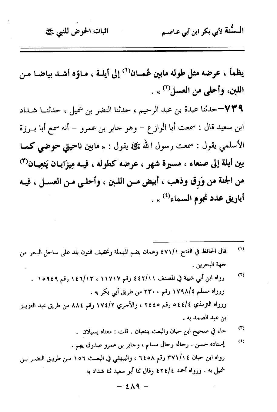 739 - حَدَّثنا عَبْدَةُ بْنُ عَبْدِ الرَّحِيمِ، حَدَّثنا النَّضْرُ بْنُ شُمَيْلٍ، حَدَّثنا شَدَّادُ بْنُ سَعِيدٍ، قَالَ: سَمِعْتُ أَبَا الْوَازِعِ، وَهُوَ جَابِرُ بْنُ عَمْرٍو، أَنَّهُ سَمِعَ أَبَا بَرْزَةَ الأَسْلَمِيَّ، يَقُولُ: سَمِعْتُ رَسُولَ اللهِ صَلى الله عَلَيهِ وسَلمَ يَقُولُ: مَا بَيْنَ نَاحِيَتَيْ حَوْضِي كَمَا بَيْنَ أَيْلَةَ إِلَى صَنْعَاءَ مَسِيرَةُ شَهْرٍ، عَرْضُهُ كَطُولِهِ، فِيهِ مِيزَابَانِ يَثْعَبَانِ مِنَ الْجَنَّةِ مِنْ وَرِقٍ وَذَهَبٍ، أَبْيَضُ مِنَ اللَّبَنِ، وَأَحْلَى مِنَ الْعَسَلِ، فِيهِ أَبَارِيقُ عَدَدَ نُجُومِ السَّمَاءِ.