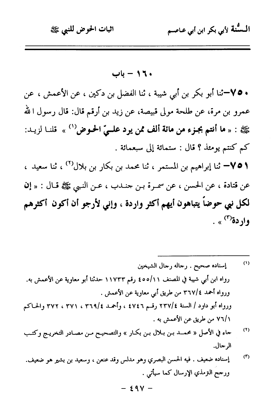 750 - حَدَّثنا أَبُو بَكْرِ بْنُ أَبِي شَيْبَةَ, حَدَّثنا الْفَضْلُ بْنُ دُكَيْنٍ، عَنِ الأَعْمَشِ، عَنْ عَمْرِو بْنِ مُرَّةَ، عَنْ طَلْحَةَ, مَوْلَى قَبِيصَةَ, عَنْ زَيْدِ بْنِ أَرْقَمَ، قَالَ: قَالَ رَسُولُ اللهِ صَلى الله عَلَيهِ وسَلمَ: مَا أَنْتُمْ بِجُزْءٍ مِنْ مِئَةِ أَلْفٍ مِمَّنْ يَرِدُ عَلَيَّ الْحَوْضَ، قُلْنَا لِزَيْدٍ: كَمْ كُنْتُمْ يَوْمَئِذٍ؟ قَالَ: سِتَّمِئَةٍ إِلَى سَبْعِمِئَةٍ.