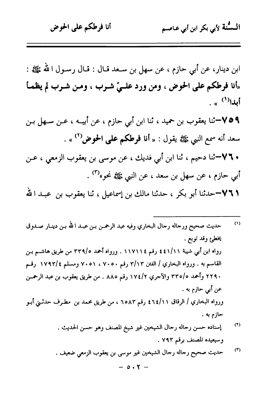 759 - حَدَّثنا يَعْقُوبُ بْنُ حُمَيْدٍ، حَدَّثنا ابْنُ أَبِي حَازِمٍ، عَنْ أَبِيهِ، عَنْ سَهْلِ بْنِ سَعْدٍ، أَنَّهُ سَمِعَ النَّبِيَّ صَلى الله عَلَيهِ وسَلمَ يَقُولُ: أَنَا فَرَطُكُمْ عَلَى الْحَوْضِ.