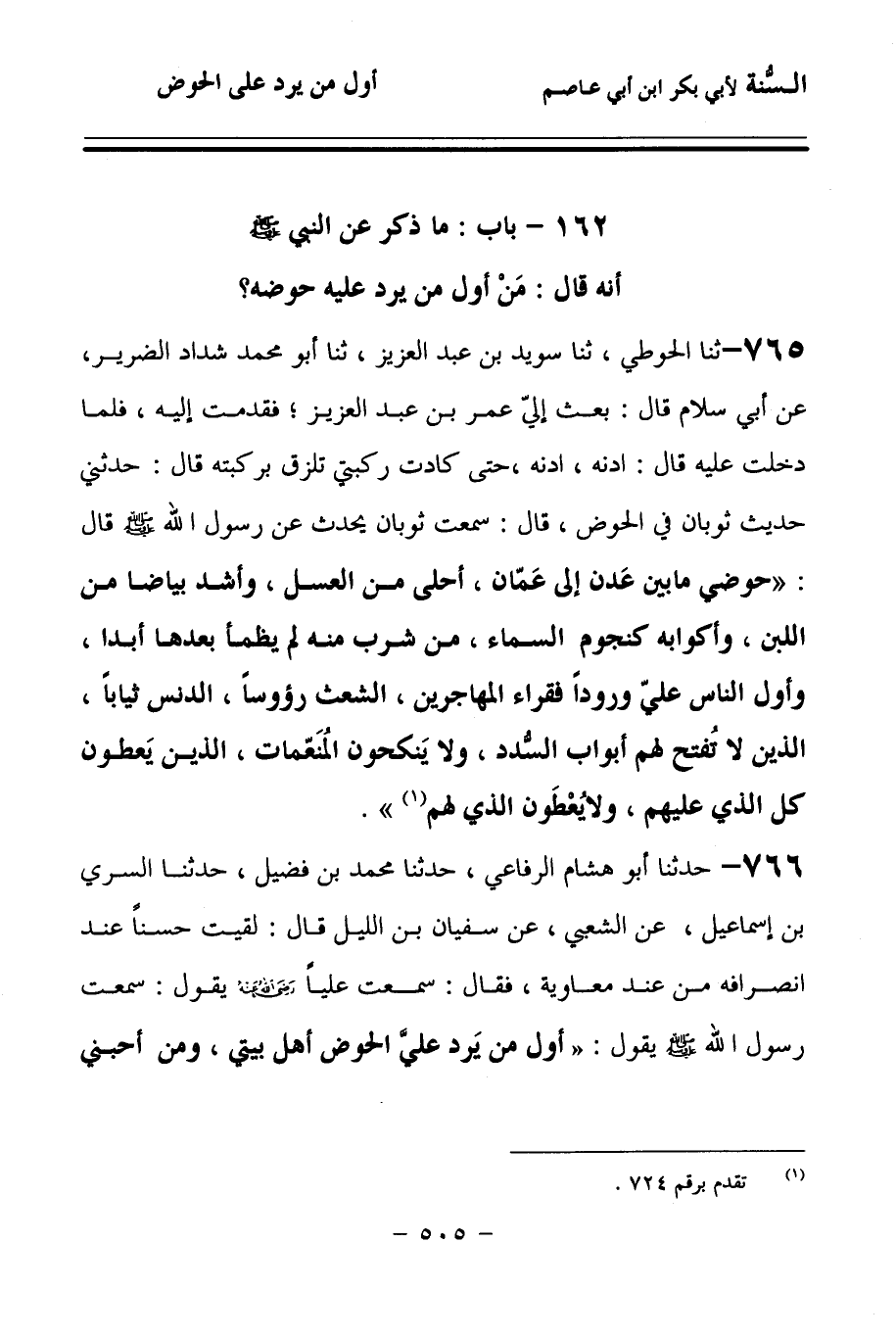 765 - حَدَّثنا الْحَوْطِيُّ، حَدَّثنا سُوَيْدُ بْنُ عَبْدِ الْعَزِيزِ، حَدَّثنا أَبُو مُحَمَّدٍ شَدَّادُ الضَّرِيرُ، عَنْ أَبِي سَلاَمٍ، قَالَ: بَعَثَ إِلَيَّ عُمَرُ بْنُ عَبْدِ الْعَزِيزِ، فَقَدِمْتُ إِلَيْهِ، فَلَمَّا دَخَلْتُ عَلَيْهِ قَالَ: ادْنُهْ ادْنُهْ، حَتَّى كَادَتْ رُكْبَتِي تَلْزَقُ بِرُكْبَتِهِ، قَالَ: حَدِّثْنِي حَدِيثَ ثَوْبَانَ فِي الْحَوْضِ، قَالَ: سَمِعْتُ ثَوْبَانَ يُحَدِّثُ عَنْ رَسُولِ اللهِ صَلى الله عَلَيهِ وسَلمَ قَالَ: حَوْضِي مَا بَيْنَ عَدَنٍ إِلَى عَمَّانَ، أَحْلَى مِنَ الْعَسَلِ، وَأَشَدُّ بَيَاضًا مِنَ اللَّبَنِ، وَأَكْوَابُهُ كَنُجُومِ السَّمَاءِ، مَنْ شَرِبَ مِنْهُ لَمْ يَظْمَأْ بَعْدَهَا أَبَدًا، وَأَوَّلُ النَّاسِ عَلَيَّ وُرُودًا فُقَرَاءُ الْمُهَاجِرِينَ، الشُّعْثُ رُؤُوسًا، الدُّنْسُ ثِيَابًا، الَّذِينَ لاَ تُفْتَحُ لَهُمْ أَبُوابُ السُّدَدِ، وَلاَ يَنْكِحُونَ الْمُنَعَّمَاتِ، الَّذِينَ يُعْطُونَ كُلَّ الَّذِي عَلَيْهِمْ، وَلاَ يُعْطَوْنَ الَّذِي لَهُمْ.