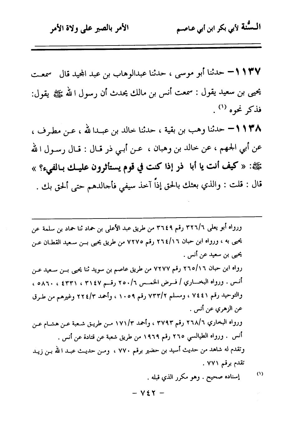 1138 - حَدَّثنا وَهْبُ بْنُ بَقِيَّةَ، حَدَّثنا خَالِدُ بْنُ عَبْدِ اللهِ، عَنْ مُطَرِّفٍ، عَنْ أَبِي الْجَهْمِ، عَنْ خَالِدِ بْنِ وَهْبَانَ، عَنْ أَبِي ذَرٍّ، قَالَ: قَالَ رَسُولُ اللهِ صَلى الله عَلَيهِ وسَلمَ: كَيْفَ أَنْتَ يَا أَبَا ذَرٍّ إِذَا كُنْتَ فِي قَوْمٍ يَسْتَأْثِرُونَ عَلَيْكَ بِالْفَيْءِ؟ قَالَ: قُلْتُ: وَالَّذِي بَعَثَكَ بِالْحَقِّ إِذًا آخُذُ سَيْفِي فَأُجَالِدُهُمْ حَتَّى أَلْحَقَ بِكَ، قَالَ: أَوَلاَ أَدُلُّكَ عَلَى خَيْرٍ مِنْ ذَلِكَ، تَصْبِرُ حَتَّى تَلْقَانِي.
