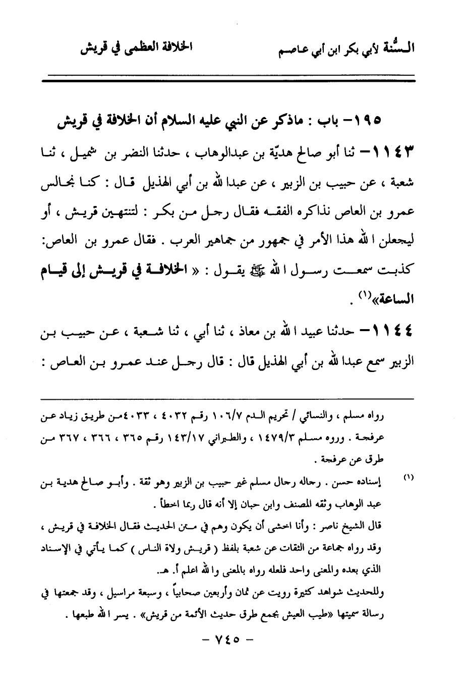 1143 - حَدَّثنا أَبُو صَالِحٍ هَدِيَّةُ بْنُ عَبْدِ الْوَهَّابِ، حَدَّثنا النَّضْرُ بْنُ شُمَيْلٍ، حَدَّثنا شُعْبَةُ، عَنْ حَبِيبِ بْنِ الزُّبَيْرِ، عَنْ عَبْدِ اللهِ بْنِ أَبِي الْهُذَيْلِ، قَالَ: كُنَّا نُجَالِسُ عَمْرَو بْنَ الْعَاصِ, نُذَاكِرُهُ الْفِقْهَ، فَقَالَ رَجُلٌ مِنْ بَكْرٍ: لَتَنْتَهِيَنَّ قُرَيْشٌ، أَوْ لَيَجْعَلَنَّ اللهُ هَذَا الأَمْرَ فِي جُمْهُورٍ مِنْ جَمَاهِيرِ الْعَرَبِ, فَقَالَ عَمْرُو بْنُ الْعَاصِ: كَذَبْتَ، سَمِعْتُ رَسُولَ اللهِ صَلى الله عَلَيهِ وسَلمَ يَقُولُ: الْخِلاَفَةُ فِي قُرَيْشٍ إِلَى قِيَامِ السَّاعَةِ.