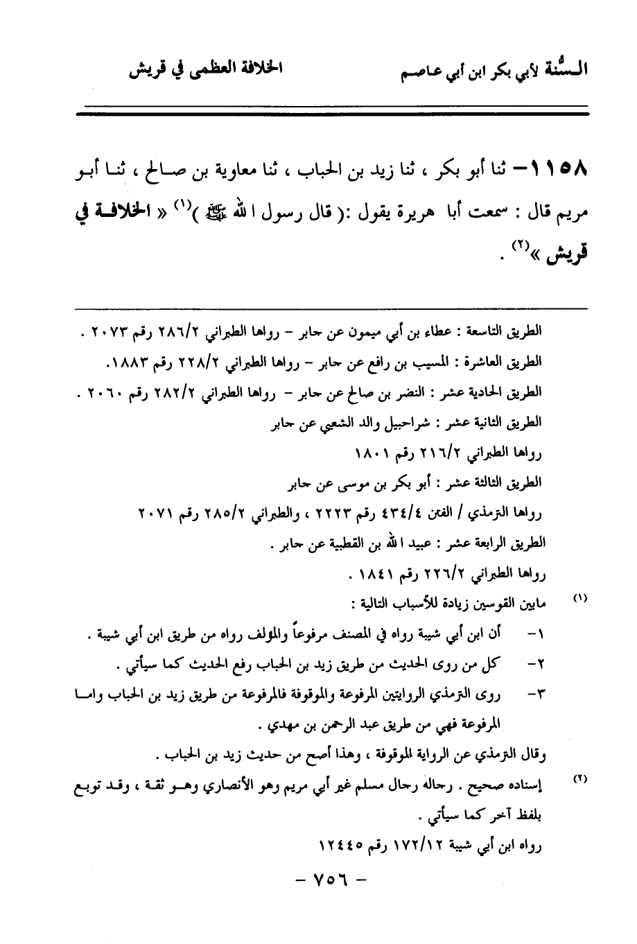 1158 - حَدَّثنا أَبُو بَكْرٍ، حَدَّثنا زَيْدُ بْنُ الْحُبَابِ، حَدَّثنا مُعَاوِيَةُ بْنُ صَالِحٍ، حَدَّثنا أَبُو مَرْيَمَ، قَالَ: سَمِعْتُ أَبَا هُرَيْرَةَ يَقُولُ: (قَالَ رَسُولُ اللهِ صَلى الله عَلَيهِ وسَلمَ): الْخِلاَفَةُ فِي قُرَيْشٍ.