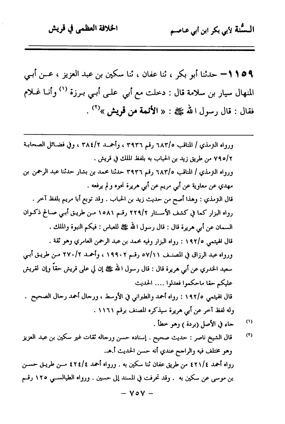 1159 - حَدَّثنا أَبُو بَكْرٍ، حَدَّثنا عَفَّانُ، حَدَّثنا سُكَيْنُ بْنُ عَبْدِ الْعَزِيزِ، عَنْ أَبِي الْمِنْهَالِ سَيَّارِ بْنِ سَلاَمَةَ، قَالَ: دَخَلْتُ مَعَ أَبِي عَلَى أَبِي بَرْزَةَ، وَأَنَا غُلاَمٌ، فَقَالَ: قَالَ رَسُولُ اللهِ صَلى الله عَلَيهِ وسَلمَ: الأَئِمَّةُ مِنْ قُرَيْشٍ.