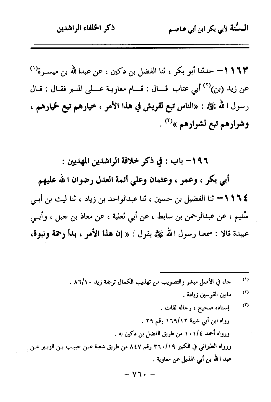 1163 - حَدَّثنا أَبُو بَكْرٍ، حَدَّثنا الْفَضْلُ بْنُ دُكَيْنٍ، عَنْ عَبْدِ اللهِ بْنِ مَيْسَرَةَ، عَنْ زَيْدِ (بن) أَبِي عَتَّابٍ، قَالَ: قَامَ مُعَاوِيَةُ عَلَى الْمِنْبَرِ، فَقَالَ: قَالَ رَسُولُ اللهِ صَلى الله عَلَيهِ وسَلمَ: النَّاسُ تَبَعٌ لِقُرَيْشٍ فِي هَذَا الأَمْرِ، خِيَارُهُمْ تَبَعٌ لِخِيَارِهِمْ، وَشِرَارُهُمْ تَبَعٌ لِشِرَارِهِمْ.