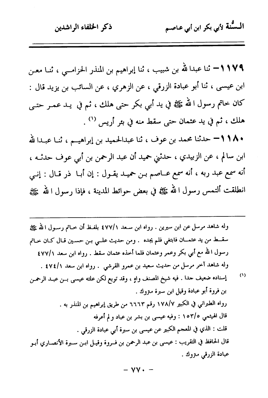 1179 - حَدَّثنا عَبْدُ اللهِ بْنُ شَبِيبٍ، حَدَّثنا إِبْرَاهِيمُ بْنُ الْمُنْذِرِ الْحِزَامِيُّ، حَدَّثنا مَعْنُ بْنُ عِيسَى، حَدَّثنا أَبُو عُبَادَةَ الزُّرَقِيُّ، عَنِ الزُّهْرِيِّ، عَنِ السَّائِبِ بْنِ يَزِيدَ، قَالَ: كَانَ خَاتَمُ رَسُولِ اللهِ صَلى الله عَلَيهِ وسَلمَ فِي يَدِ أَبِي بَكْرٍ حَتَّى هَلَكَ، ثُمَّ فِي يَدِ عُمَرَ حَتَّى هَلَكَ، ثُمَّ فِي يَدِ عُثْمَانَ, حَتَّى سَقَطَ مِنْهُ فِي بِئْرِ أَرِيسٍ.