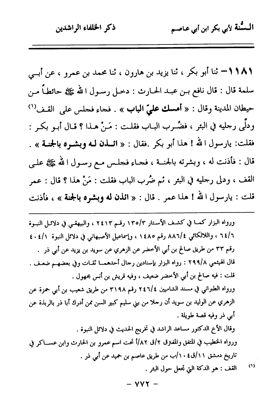 1181 - حَدَّثنا أَبُو بَكْرٍ، حَدَّثنا يَزِيدُ بْنُ هَارُونَ، حَدَّثنا مُحَمَّدُ بْنُ عَمْرٍو، عَنْ أَبِي سَلَمَةَ، قَالَ: قَالَ نَافِعُ بْنُ عَبْدِ الْحَارِثِ: دَخَلَ رَسُولُ اللهِ صَلى الله عَلَيهِ وسَلمَ حَائِطًا مِنْ حِيطَانِ الْمَدِينَةِ، وَقَالَ: أَمْسِكْ عَلِيَّ الْبَابَ، فَجَاءَ, فَجَلَسَ عَلَى الْقُفِّ, وَدَلَّى رِجْلَيْهِ فِي الْبِئْرِ، فَضُرِبَ الْبَابُ، فَقُلْتُ: مَنْ هَذَا؟ قَالَ: أَبُو بَكْرٍ، فَقُلْتُ: يَا رَسُولَ اللهِ, هَذَا أَبُو بَكْرٍ، فَقَالَ: ائْذَنْ لَهُ، وَبَشِّرْهُ بِالْجَنَّةِ، قَالَ: فَأَذِنْتُ لَهُ, وَبَشَّرْتُهُ بِالْجَنَّةِ، فَجَاءَ, فَجَلَسَ مَعَ رَسُولِ اللهِ صَلى الله عَلَيهِ وسَلمَ عَلَى الْقُفِّ, وَدَلَّى رِجْلَيْهِ فِي الْبِئْرِ، ثُمَّ ضُرِبَ الْبَابُ، فَقُلْتُ: مَنْ هَذَا؟ قَالَ: عُمَرُ، قُلْتُ: يَا رَسُولَ اللهِ, هَذَا عُمَرُ، قَالَ: ائْذَنْ لَهُ, وَبَشِّرْهُ بِالْجَنَّةِ، فَأَذِنْتُ لَهُ, وَبَشَّرْتُهُ بِالْجَنَّةِ، فَجَاءَ, فَجَلَسَ مَعَ رَسُولِ اللهِ صَلى الله عَلَيهِ وسَلمَ عَلَى الْقُفِّ, وَدَلَّى رِجْلَيْهِ فِي الْبِئْرِ، ثُمَّ ضُرِبَ الْبَابُ، فَقُلْتُ: مَنْ هَذَا؟ فَقَالَ: عُثْمَانُ، فَقُلْتُ: يَا رَسُولَ اللهِ, هَذَا عُثْمَانُ، قَالَ: ائْذَنْ لَهُ, وَبَشِّرْهُ بِالْجَنَّةِ، مَعَهَا بَلاَءٌ، فَأَذِنْتُ لَهُ, وَبَشَّرْتُهُ بِالْجَنَّةِ، قَالَ: فَجَاءَ, فَجَلَسَ مَعَ رَسُولِ اللهِ صَلى الله عَلَيهِ وسَلمَ عَلَى قُفِّهِ, وَدَلَّى رِجْلَيْهِ فِي الْبِئْرِ.
