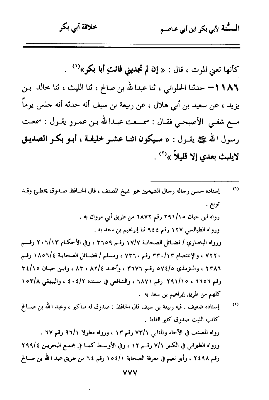1186 - حَدَّثنا الْحُلْوَانِيُّ، حَدَّثنا عَبْدُ اللهِ بْنُ صَالِحٍ، حَدَّثنا اللَّيْثُ، حَدَّثنا خَالِدُ بْنُ يَزِيدَ، عَنْ سَعِيدِ بْنِ أَبِي هِلاَلٍ، عَنْ رَبِيعَةَ بْنِ سَيْفٍ، أَنَّهُ حَدَّثَهُ, أَنَّهُ جَلَسَ يَوْمًا مَعَ شُفَيٍّ الأَصْبَحِيِّ، فَقَالَ: سَمِعْتُ عَبْدَ اللهِ بْنَ عَمْرٍو يَقُولُ: سَمِعْتُ رَسُولَ اللهِ صَلى الله عَلَيهِ وسَلمَ يَقُولُ: سَيَكُونُ اثْنَا عَشَرَ خَلِيفَةً، [مِنْهُمْ] أَبُو بَكْرٍ الصِّدِّيقُ، لاَ يَلْبَثُ بَعْدِي إِلاَّ قَلِيلاً.