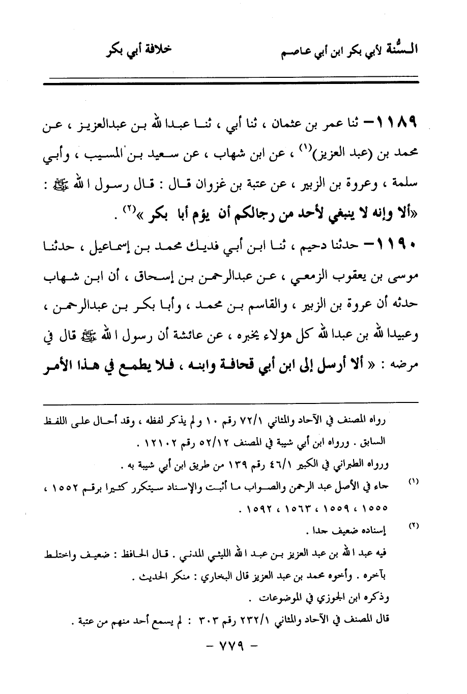1189 - حَدَّثنا عَمْرُو (1) بْنُ عُثْمَانَ، حَدَّثنا أَبِي، حَدَّثنا عَبْدُ اللهِ بْنُ عَبْدِ الْعَزِيزِ، عَنْ مُحَمَّدِ بْنِ عَبْدِ الْعَزِيزِ، عَنِ ابْنِ شِهَابٍ، عَنْ سَعِيدِ بْنِ الْمُسَيِّبِ, وأَبِي سَلَمَةَ, وعُرْوَةَ بْنِ الزُّبَيْرِ، عَنْ عُتْبَةَ بْنِ غَزْوَانَ، قَالَ: قَالَ رَسُولُ اللهِ صَلى الله عَلَيهِ وسَلمَ: أَلاَ وَإِنَّهُ لاَ يَنْبَغِي لأَحَدٍ مِنْ رِجَالِكُمْ أَنْ يَؤُمَّ أَبَا بَكْرٍ.