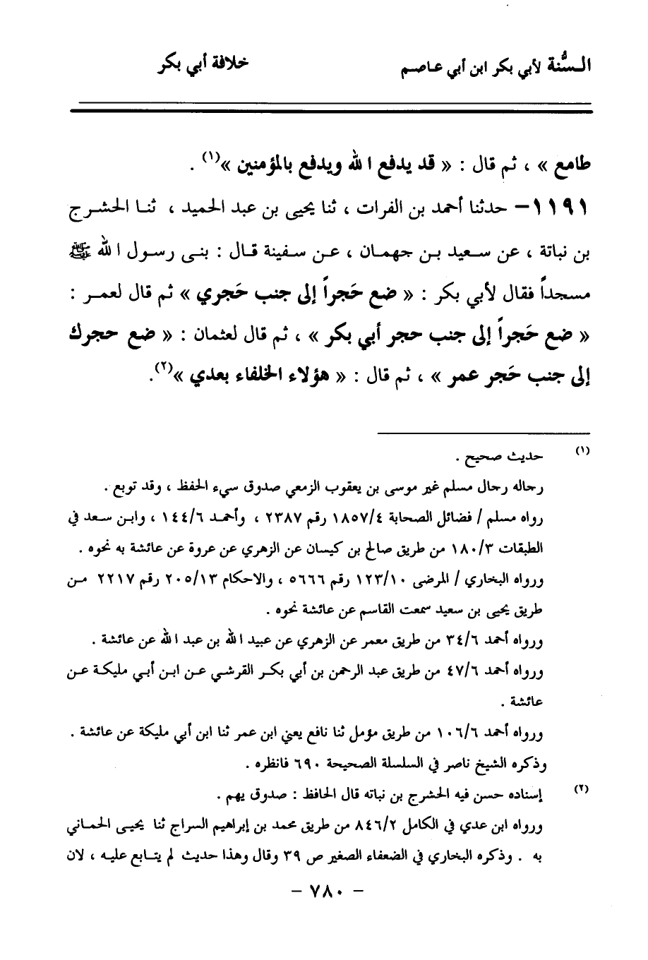 1191 - حَدَّثنا أَحْمَدُ بْنُ الْفُرَاتِ، حَدَّثنا يَحْيَى بْنُ عَبْدِ الْحَمِيدِ، حَدَّثنا الْحَشْرَجُ بْنُ نُبَاتَةَ، عَنْ سَعِيدِ بْنِ جُمْهَانَ، عَنْ سَفِينَةَ، قَالَ: بَنَى رَسُولُ اللهِ صَلى الله عَلَيهِ وسَلمَ مَسْجِدًا، فَقَالَ لأَبِي بَكْرٍ: ضَعْ حَجَرًا إِلَى جَنْبِ حَجَرِي، ثُمَّ قَالَ لِعُمَرَ: ضَعْ حَجَرًا إِلَى جَنْبِ حَجَرِ أَبِي بَكْرٍ، ثُمَّ قَالَ لِعُثْمَانَ: ضَعْ حَجَرَكَ إِلَى جَنْبِ حَجَرِ عُمَرَ، ثُمَّ قَالَ: هَؤُلاَءِ الْخُلَفَاءُ بَعْدِي.