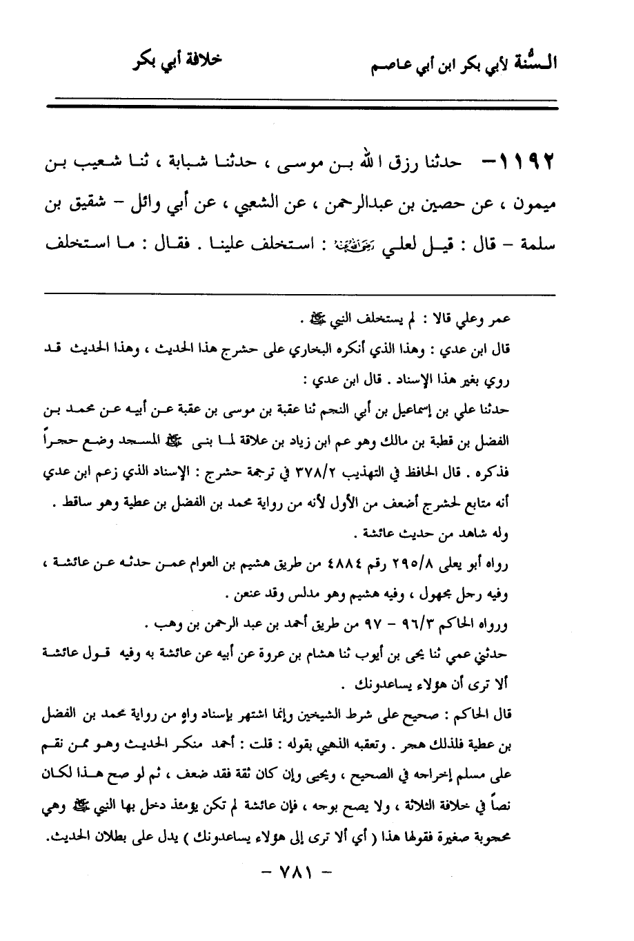 1192 - حَدَّثنا رِزْقُ اللهِ بْنُ مُوسَى، حَدَّثنا شَبَابَةُ، حَدَّثنا شُعَيْبُ بْنُ مَيْمُونٍ، عَنْ حُصَيْنِ بْنِ عَبْدِ الرَّحْمَنِ، عَنِ الشَّعْبِيِّ، عَنْ أَبِي وَائِلٍ شَقِيقِ بْنِ سَلَمَةَ، قَالَ: قِيلَ لِعَلِيٍّ رَضِيَ اللهُ عَنْهُ: اسْتَخْلِفْ عَلَيْنَا، فَقَالَ: مَا اسْتَخْلَفَ رَسُولُ اللهِ صَلى الله عَلَيهِ وسَلمَ، وَلَكِنْ إِنْ يُرِدِ اللهُ بِالنَّاسِ خَيْرًا سَيَجْمَعُهُمْ عَلَى خَيْرِهِمْ, كَمَا جَمَعَهُمْ بَعْدَ نَبِيِّهِمْ صَلى الله عَلَيهِ وسَلمَ عَلَى خَيْرِهِمْ.