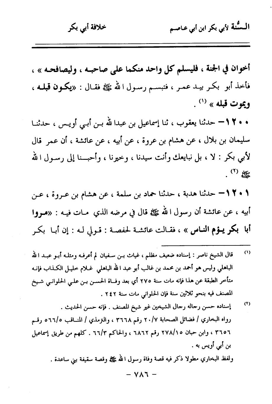 1200 - حَدَّثنا يَعْقُوبُ، حَدَّثنا إِسْمَاعِيلُ بْنُ عَبْدِ اللهِ بْنِ أَبِي أُوَيْسٍ، حَدَّثنا سُلَيْمَانُ بْنُ بِلاَلٍ، عَنْ هِشَامِ بْنِ عُرْوَةَ، عَنْ أَبِيهِ، عَنْ عَائِشَةَ، أَنَّ عُمَرَ قَالَ لأَبِي بَكْرٍ: لاَ، بَلْ نُبَايِعُكَ وَأَنْتَ سَيِّدُنَا، وَخَيْرُنَا، وَأَحَبُّنَا إِلَى رَسُولِ اللهِ صَلى الله عَلَيهِ وسَلمَ.