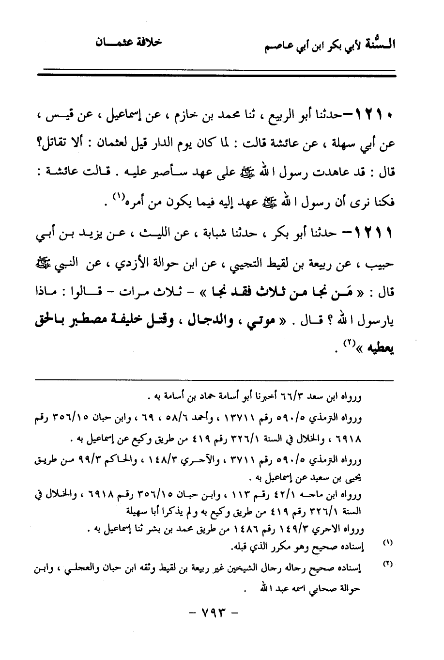 1211 - حَدَّثنا أَبُو بَكْرٍ، حَدَّثنا شَبَابَةُ، عَنِ اللَّيْثِ، عَنْ يَزِيدَ بْنِ أَبِي حَبِيبٍ، عَنْ رَبِيعَةَ بْنِ لَقِيطٍ التُّجِيبِيِّ، عَنِ ابْنِ حَوَالَةَ الأَزْدِيِّ، عَنِ النَّبِيِّ صَلى الله عَلَيهِ وسَلمَ قَالَ: مَنْ نَجَا مِنْ ثَلاَثٍ فَقَدْ نَجَا, ثَلاَثَ مَرَّاتٍ، قَالُوا: مَاذَا يَا رَسُولَ اللهِ؟ قَالَ: مَوْتِي، وَالدَّجَّالِ، وَقَتْلِ خَلِيفَةٍ مُصْطَبِرٍ بِالْحَقِّ يُعْطِيهِ.