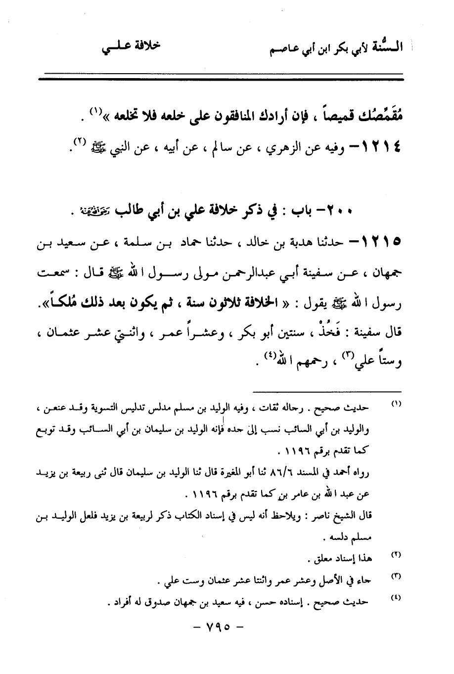 1215 - حَدَّثنا هُدْبَةُ بْنُ خَالِدٍ، حَدَّثنا حَمَّادُ بْنُ سَلَمَةَ، عَنْ سَعِيدِ بْنِ جُمْهَانَ، عَنْ سَفِينَةَ أَبِي عَبْدِ الرَّحْمَنِ, مَوْلَى رَسُولِ اللهِ صَلى الله عَلَيهِ وسَلمَ، قَالَ: سَمِعْتُ رَسُولَ اللهِ صَلى الله عَلَيهِ وسَلمَ يَقُولُ: الْخِلاَفَةُ ثَلاَثُونَ سَنَةً، ثُمَّ يَكُونُ بَعْدَ ذَلِكَ مُلْكًا, قَالَ سَفِينَةُ: فَخُذْ سَنَتَيْنِ أَبُو بَكْرٍ، وَعَشْرًا عُمَرُ، وَاثْنَتَيْ عَشْرَ عُثْمَانَ، وَسِتًّا عَلِيٌّ, رَحِمَهُمُ اللهُ.
