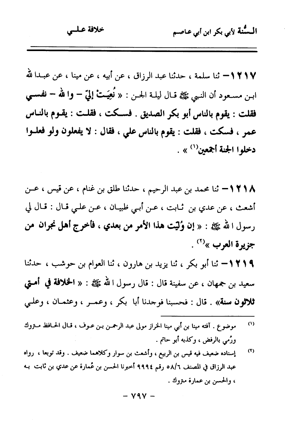 1217 - حَدَّثنا سَلَمَةُ، حَدَّثنا عَبْدُ الرَّزَّاقِ، عَنْ أَبِيهِ، عَنْ مِينَا، عَنْ عَبْدِ اللهِ بْنِ مَسْعُودٍ، أَنَّ النَّبِيَّ صَلى الله عَلَيهِ وسَلمَ قَالَ: لَيْلَةَ الْجِنِّ نُعِيَتْ إِلَيَّ وَاللهِ نَفْسِي، فَقُلْتُ: يَقُومُ بِالنَّاسِ أَبُو بَكْرٍ الصِّدِّيقُ, فَسَكَتَ، فَقُلْتُ: يَقُومُ بِالنَّاسِ عُمَرُ؟ فَسَكَتَ، فَقُلْتُ: يَقُومُ بِالنَّاسِ عَلِيٌّ؟ فَقَالَ: لاَ يَفْعَلُونَ، وَلَوْ فَعَلُوا، دَخَلُوا الْجَنَّةَ أَجْمَعِينَ.