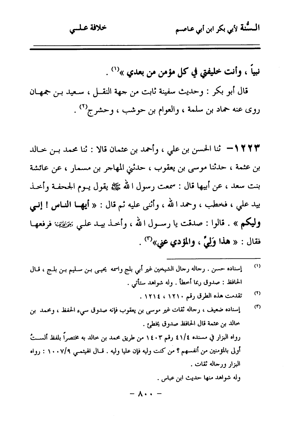 1223 - حَدَّثنا الْحَسَنُ بْنُ عَلِيٍّ، وأَحْمَدُ بْنُ عُثْمَانَ، قَالاَ: حَدَّثنا مُحَمَّدُ بْنُ خَالِدِ بْنِ عَثْمَةَ، حَدَّثنا مُوسَى بْنُ يَعْقُوبَ، حَدَّثَنِي الْمُهَاجِرُ بْنُ مِسْمَارٍ، عَنْ عَائِشَةَ بِنْتِ سَعْدٍ، عَنْ أَبِيهَا، قَالَ: سَمِعْتُ رَسُولَ اللهِ صَلى الله عَلَيهِ وسَلمَ يَقُولُ يَوْمَ الْجُحْفَةِ، وَأَخَذَ بَيَدِ عَلِيٍّ، فَخَطَبَ، وَحَمِدَ اللهَ وَأَثْنَى عَلَيْهِ، ثُمَّ قَالَ: أَيُّهَا النَّاسُ: إِنِّي وَلِيُّكُمْ، قَالُوا: صَدَقْتَ يَا رَسُولَ اللهِ، وَأَخَذَ بَيَدِ عَلِيٍّ رَضِيَ اللهُ عَنْهُ، فَرَفَعَهَا، فَقَالَ: هَذَا وَلِيِّي، وَالْمُؤَدِّي عَنِّي.