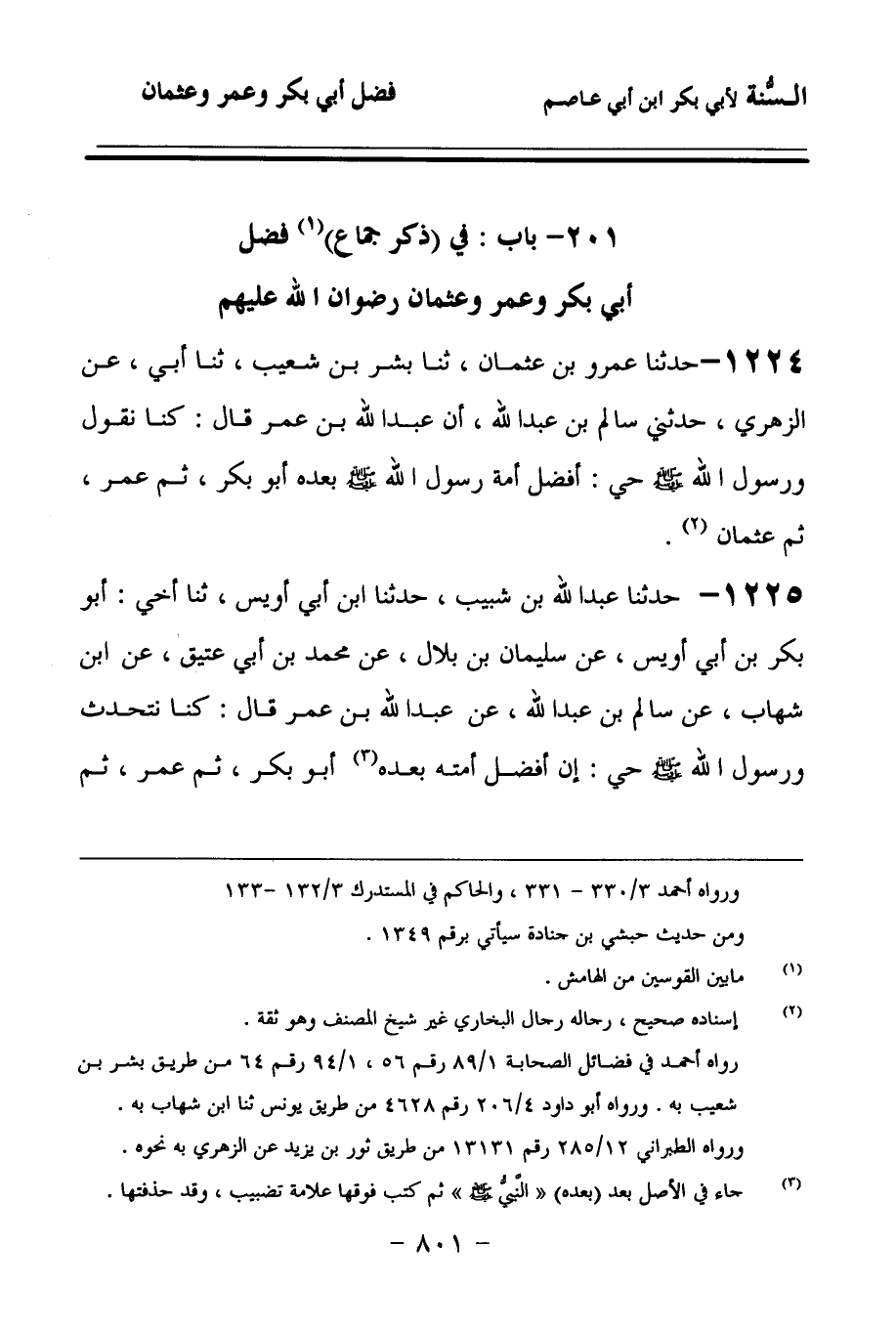 1225 - حَدَّثنا عَبْدُ اللهِ بْنُ شَبِيبٍ، حَدَّثنا ابْنُ أَبِي أُوَيْسٍ، حَدَّثنا أَخِي أَبُو بَكْرِ بْنُ أَبِي أُوَيْسٍ، عَنْ سُلَيْمَانَ بْنِ بِلاَلٍ، عَنْ مُحَمَّدِ بْنِ أَبِي عَتِيقٍ، عَنِ ابْنِ شِهَابٍ، عَنْ سَالِمِ بْنِ عَبْدِ اللهِ، عَنْ عَبْدِ اللهِ بْنِ عُمَرَ، قَالَ: كُنَّا نَتَحَدَّثُ وَرَسُولُ اللهِ صَلى الله عَلَيهِ وسَلمَ حَيٌّ: إِنَّ أَفْضَلَ أُمَّتِهِ بَعْدَهُ: أَبُو بَكْرٍ، ثُمَّ عُمَرُ، ثُمَّ عُثْمَانُ.