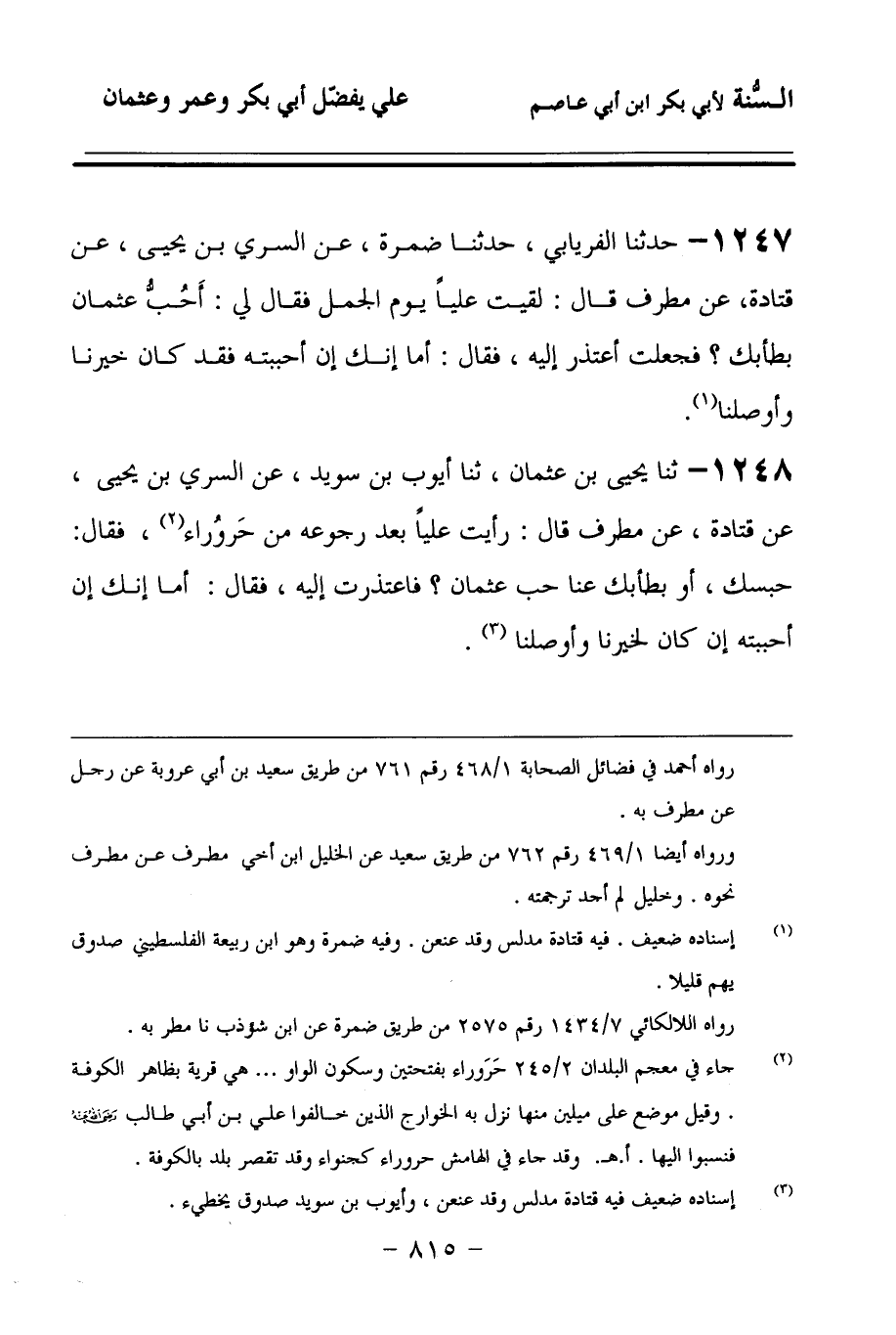 1248 - حَدَّثنا يَحْيَى بْنُ عُثْمَانَ، حَدَّثنا أَيُّوبُ بْنُ سُوَيْدٍ، عَنِ السَّرِيِّ بْنِ يَحْيَى، عَنْ قَتَادَةَ، عَنْ مُطَرِّفٍ، قَالَ: رَأَيْتُ عَلِيًّا بَعْدَ رُجُوعِهِ مِنْ حَرُورَاءَ، فَقَالَ: حَبَسَكَ، أَوْ بَطَّأَ بِكَ عَنَّا حُبُّ عُثْمَانَ، فَاعْتَذَرْتُ إِلَيْهِ، فَقَالَ: أَمَا إِنَّكَ إِنْ أَحْبَبْتَهُ إِنْ كَانَ لَخَيْرَنَا وَأَوْصَلَنَا.