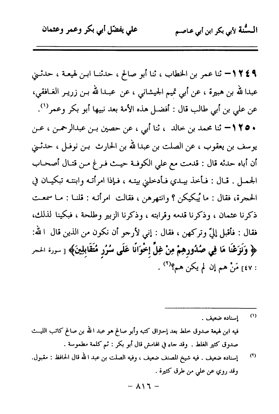 1249 - حَدَّثنا عُمَرُ بْنُ الْخَطَّابِ، حَدَّثنا أَبُو صَالِحٍ، حَدَّثنا ابْنُ لَهِيعَةَ، حَدَّثَنِي عَبْدُ اللهِ بْنُ هُبَيْرَةَ، عَنْ أَبِي تَمِيمٍ الْجَيْشَانِيِّ، عَنْ عَبْدِ اللهِ بْنِ زُرَيْرٍ الْغَافِقِيِّ، عَنْ عَلِيِّ بْنِ أَبِي طَالِبٍ، قَالَ: أَفْضَلُ هَذِهِ الأُمَّةِ بَعْدَ نَبِيِّهَا: أَبُو بَكْرٍ، وَعُمَرُ.