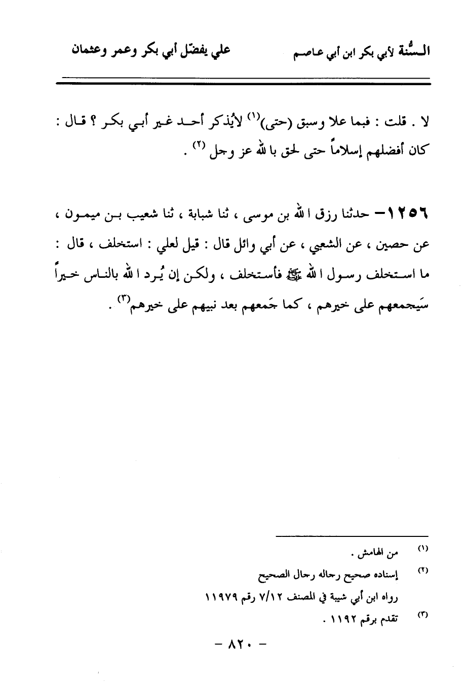 1256 - حَدَّثنا رِزْقُ اللهِ بْنُ مُوسَى، حَدَّثنا شَبَابَةُ، حَدَّثنا شُعَيْبُ بْنُ مَيْمُونٍ، عَنْ حُصَيْنٍ، عَنِ الشَّعْبِيِّ، عَنْ أَبِي وَائِلٍ، قَالَ: قِيلَ لِعَلِيٍّ: اسْتَخْلِفَ، قَالَ: مَا اسْتَخْلَفَ رَسُولُ اللهِ صَلى الله عَلَيهِ وسَلمَ فَأَسْتَخْلِفُ، وَلَكِنْ إِنْ يُرِدِ اللهُ بِالنَّاسِ خَيْرًا سَيَجْمَعُهُمْ عَلَى خَيْرِهِمْ, كَمَا جَمَعَهُمْ بَعْدَ نَبِيِّهِمْ عَلَى خَيْرِهِمْ.
