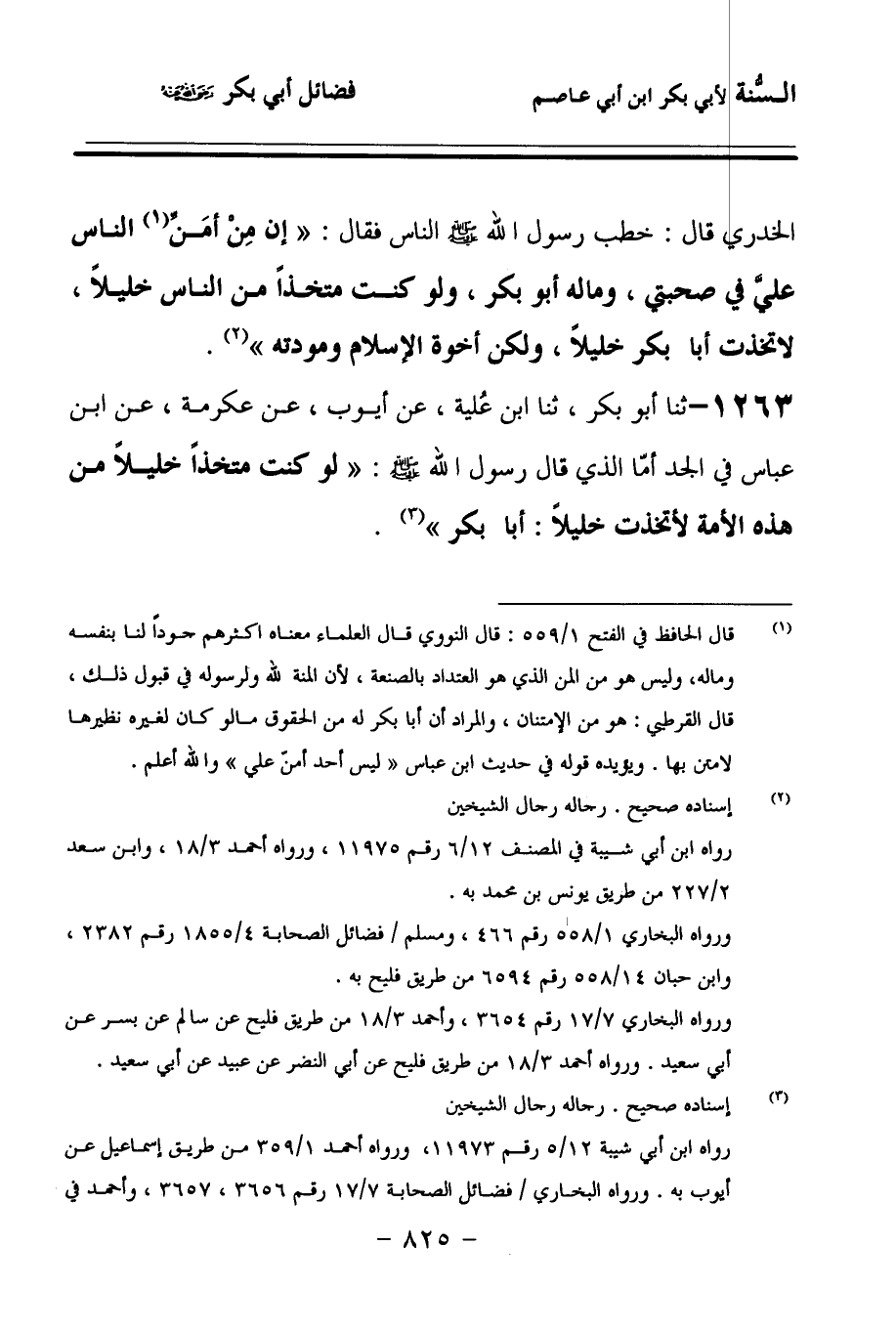 1263 - حَدَّثنا أَبُو بَكْرٍ، حَدَّثنا ابْنُ عُلَيَّةَ، عَنْ أَيُّوبَ، عَنْ عِكْرِمَةَ، عَنِ ابْنِ عَبَّاسٍ فِي الْجَدِّ: أَمَّا الَّذِي قَالَ رَسُولُ اللهِ صَلى الله عَلَيهِ وسَلمَ: لَوْ كُنْتُ مُتَّخِذًا خَلِيلاً مِنْ هَذِهِ الأُمَّةِ، لاَتَّخَذْتُ خَلِيلاً أَبَا بَكْرٍ.