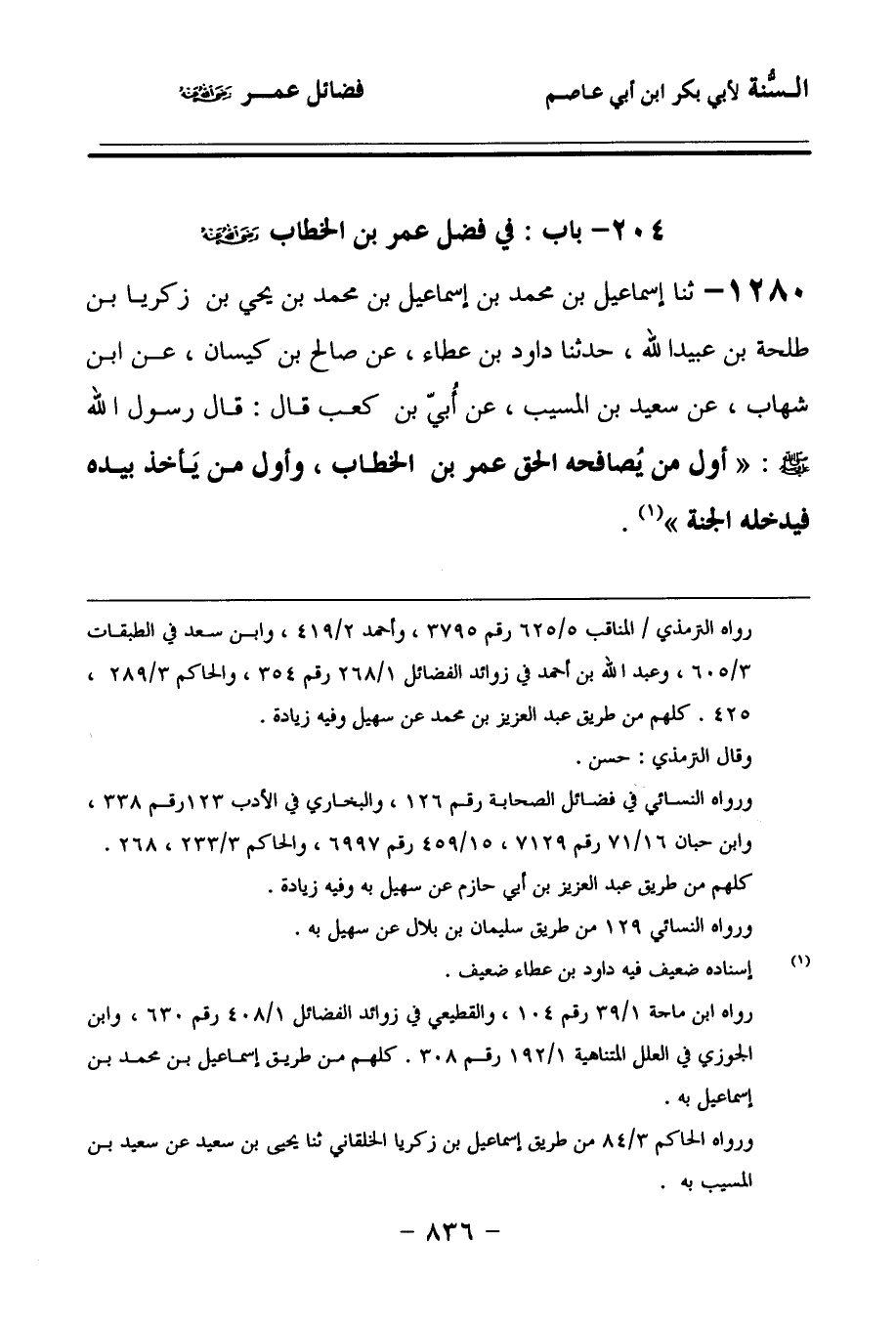 1280 - حَدَّثنا إِسْمَاعِيلُ بْنُ مُحَمَّدِ بْنِ إِسْمَاعِيلَ بْنِ مُحَمَّدِ بْنِ يَحْيَى بْنِ زَكَرِيَّا بْنِ طَلْحَةَ بْنِ عُبَيْدِ اللهِ، حَدَّثنا دَاودُ بْنُ عَطَاءٍ، عَنْ صَالِحِ بْنِ كَيْسَانَ، عَنِ ابْنِ شِهَابٍ، عَنْ سَعِيدِ بْنِ الْمُسَيِّبِ، عَنْ أُبَيِّ بْنِ كَعْبٍ، قَالَ: قَالَ رَسُولُ اللهِ صَلى الله عَلَيهِ وسَلمَ: أَوَّلُ مَنْ يُصَافِحُهُ الْحَقُّ عُمَرُ بْنُ الْخَطَّابِ، وَأَوَّلُ مَنْ يأْخُذُ بِيَدِهِ فَيُدْخِلُهُ الْجَنَّةَ.