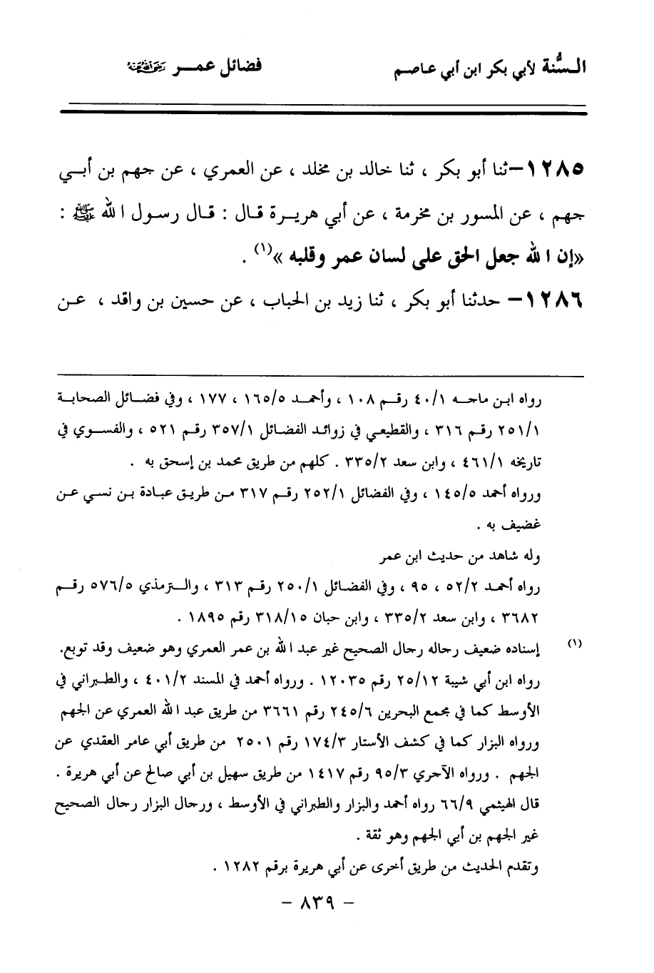 1285 - حَدَّثنا أَبُو بَكْرٍ، حَدَّثنا خَالِدُ بْنُ مَخْلَدٍ، عَنِ الْعُمَرِيِّ، عَنْ جَهْمِ بْنِ أَبِي جَهْمٍ، عَنِ الْمِسْوَرِ بْنِ مَخْرَمَةَ، عَنْ أَبِي هُرَيْرَةَ، قَالَ: قَالَ رَسُولُ اللهِ صَلى الله عَلَيهِ وسَلمَ: إِنَّ اللهَ جَعَلَ الْحَقَّ عَلَى لِسَانِ عُمَرَ وَقَلْبِهِ.