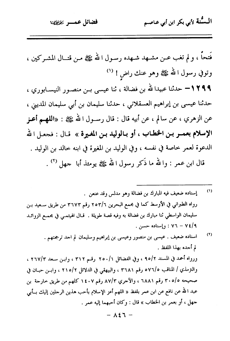 1299 - حَدَّثنا عُبَيْدُ اللهِ بْنُ فَضَالَةَ، حَدَّثنا عِيسَى بْنُ مَنْصُورٍ النَّيْسَابُورِيُّ، حَدَّثنا عِيسَى بْنُ إِبْرَاهِيمَ الْعَسْقَلاَنِيُّ، حَدَّثنا سُلَيْمَانُ بْنُ أَبِي سُلَيْمَانَ الْمَدِينِيُّ، عَنِ الزُّهْرِيِّ، عَنْ سَالِمٍ، عَنْ أَبِيهِ، قَالَ: قَالَ رَسُولُ اللهِ صَلى الله عَلَيهِ وسَلمَ: اللهُمَّ أَعِزَّ الإِسْلاَمَ بِعُمَرَ بْنِ الْخَطَّابِ، أَوْ بِالْوَلِيدِ بْنِ الْمُغِيرَةِ، قَالَ: فَجَعَلَ اللهُ الدَّعْوَةَ لِعُمَرَ خَاصَّةً فِي نَفْسِهِ، وَفِي الْوَلِيدِ بْنِ الْمُغِيرَةِ فِي ابْنِهِ خَالِدِ بْنِ الْوَلِيدِ، قَالَ ابْنُ عُمَرَ: وَاللهِ مَا ذَكَرَ رَسُولُ اللهِ صَلى الله عَلَيهِ وسَلمَ يَوْمَئِذٍ أَبَا جَهْلٍ.