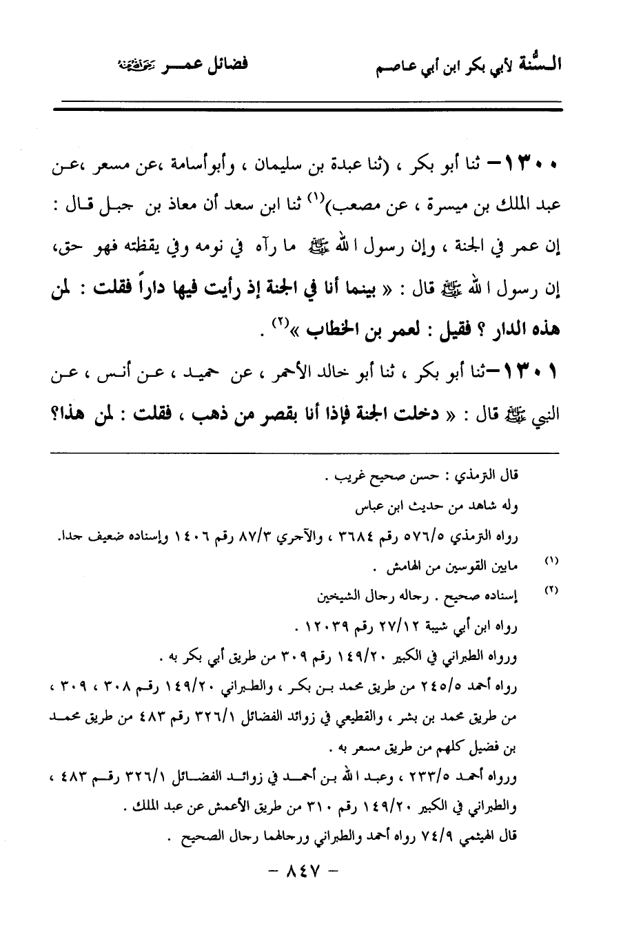 1300 - حَدَّثنا أَبُو بَكْرٍ، حَدَّثنا عَبْدَةُ بْنُ سُلَيْمَانَ، وَأَبُو أُسَامَةَ، عَنْ مِسْعَرٍ، عَنْ عَبْدِ الْمَلِكِ بْنِ مَيْسَرَةَ، عَنْ مُصْعَبٍ, حَدَّثنا ابْنُ سَعْدٍ، أَنَّ مُعَاذَ بْنَ جَبَلٍ، قَالَ: إِنَّ عُمَرَ فِي الْجَنَّةِ، وَإِنَّ رَسُولَ اللهِ صَلى الله عَلَيهِ وسَلمَ مَا رَآهُ فِي نَوْمِهِ وَفِي يَقَظَتِهِ فَهُوَ حَقٌّ، إِنَّ رَسُولَ اللهِ صَلى الله عَلَيهِ وسَلمَ قَالَ: بَيْنَمَا أَنَا فِي الْجَنَّةِ، إِذْ رَأَيْتُ فِيهَا دَارًا، فَقُلْتُ: لِمَنْ هَذِهِ الدَّارُ؟ فَقِيلَ: لِعُمَرَ بْنِ الْخَطَّابِ.
