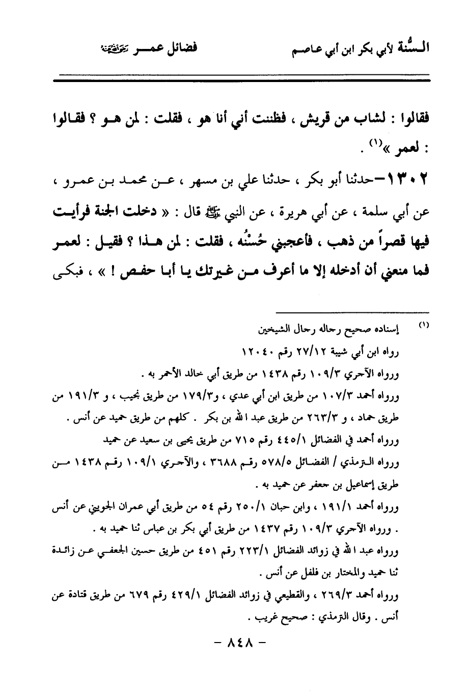 1302 - حَدَّثنا أَبُو بَكْرٍ، حَدَّثنا عَلِيُّ بْنُ مُسْهِرٍ، عَنْ مُحَمَّدِ بْنِ عَمْرٍو، عَنْ أَبِي سَلَمَةَ، عَنْ أَبِي هُرَيْرَةَ، عَنِ النَّبِيِّ صَلى الله عَلَيهِ وسَلمَ قَالَ: دَخَلْتُ الْجَنَّةَ، فَرَأَيْتُ فِيهَا قَصْرًا مِنْ ذَهَبٍ، فَأَعْجَبَنِي حُسْنُهُ، فَقُلْتُ: لِمَنْ هَذَا؟ فَقِيلَ: لِعُمَرَ، فَمَا مَنَعَنِي أَنْ أَدْخُلَهُ إِلاَّ مَا أَعْرِفُ مِنْ غَيْرَتِكَ يَا أَبَا حَفْصٍ، فَبَكَى عُمَرُ، وَقَالَ: يَا رَسُولَ اللهِ, عَلَيْكَ أَغَارُ؟.