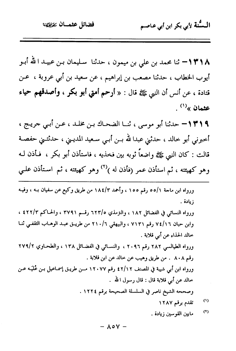 1318 - حَدَّثنا مُحَمَّدُ بْنُ عَلِيِّ بْنِ مَيْمُونٍ، حَدَّثنا سُلَيْمَانُ بْنُ عُبَيْدِ اللهِ, أَبُو أَيُّوبَ الْخَطَّابُ، حَدَّثنا مُصْعَبُ بْنُ إِبْرَاهِيمَ، عَنْ سَعِيدِ بْنِ أَبِي عَرُوبَةَ، عَنْ قَتَادَةَ، عَنْ أَنَسٍ، أَنَّ النَّبِيَّ صَلى الله عَلَيهِ وسَلمَ قَالَ: أَرْحَمُ أُمَّتِي أَبُو بَكْرٍ، وَأَصْدَقُهُمْ حَيَاءً عُثْمَانُ.