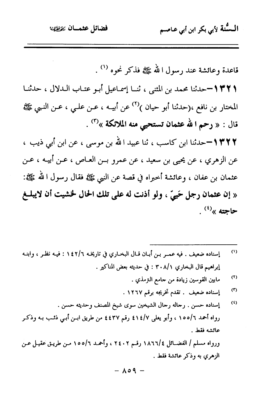 1322 - حَدَّثنا ابْنُ كَاسِبٍ، حَدَّثنا عُبَيْدُ اللهِ بْنُ مُوسَى، عَنِ ابْنِ أَبِي ذِئْبٍ، عَنِ الزُّهْرِيِّ، عَنْ يَحْيَى بْنِ سَعِيدِ بْنِ الْعَاصِ، عَنْ أَبِيهِ (1)، عَنْ عُثْمَانَ بْنِ عَفَّانَ, وَعَائِشَةَ، أَخْبَرَاهُ فِي قِصَّةٍ عَنِ النَّبِيِّ صَلى الله عَلَيهِ وسَلمَ، فَقَالَ رَسُولُ اللهِ صَلى الله عَلَيهِ وسَلمَ: إِنَّ عُثْمَانَ رَجُلٌ حَيِيٍّ، وَلَوْ أَذِنْتُ لَهُ عَلَى تِلْكَ الْحَالِ لَخَشَيْتُ أَنْ لاَ يَبْلُغَ حَاجَتَهُ.