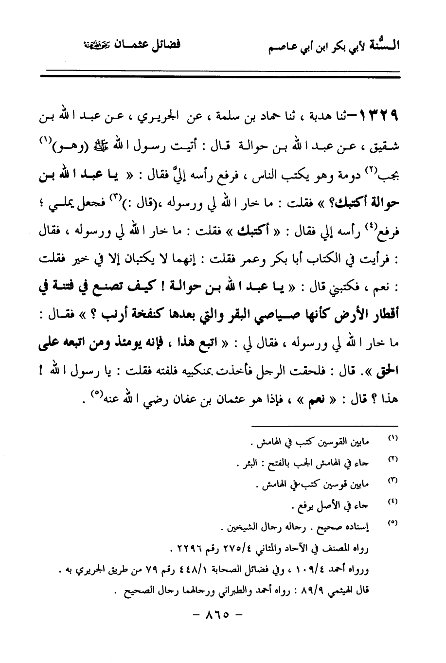 1329 - حَدَّثنا هُدْبَةُ، حَدَّثنا حَمَّادُ بْنُ سَلَمَةَ، عَنِ الْجُرَيْرِيِّ، عَنْ عَبْدِ اللهِ بْنِ شَقِيقٍ، عَنْ عَبْدِ اللهِ بْنِ حَوَالَةَ، قَالَ: أَتَيْتُ رَسُولَ اللهِ صَلى الله عَلَيهِ وسَلمَ وَهُوَ بِجُبِّ رُومَةَ (1) وَهُوَ يَكْتُبُ النَّاسَ، فَرَفَعَ رَأْسَهُ إِلَيَّ, فَقَالَ: يَا عَبْدَ اللهِ بْنَ حَوَالَةَ، أَكْتُبُكَ؟ فَقُلْتُ: مَا خَارَ اللهُ لِي وَرَسُولُهُ، قَالَ: فَجَعَلَ يُمْلِي فَرَفَعَ رَأْسَهُ إِلَيَّ، فَقَالَ: أَكْتُبُكَ؟ فَقُلْتُ: مَا خَارَ اللهُ لِي وَرَسُولُهُ، فَقَالَ: فَرَأَيْتُ فِي الْكِتَابِ أَبَا بَكْرٍ, وَعُمَرَ، فَقُلْتُ: إِنَّهُمَا لاَ يُكْتَبَانِ إِلاَّ فِي خَيْرٍ، فَقُلْتُ: نَعَمْ, فَكَتَبَنِي, قَالَ: يَا عَبْدَ اللهِ بْنَ حَوَالَةَ، كَيْفَ تَصْنَعُ فِي فِتْنَةٍ فِي أَقْطَارِ الأَرْضِ, كَأَنَّهَا صَيَاصِي الْبَقَرِ، وَالَّتِي بَعْدَهَا كَنَفْخَةِ أَرْنَبٍ؟ فَقَالَ: مَا خَارَ اللهُ لِي وَرَسُولُهُ، فَقَالَ لِي: اتَّبِعْ هَذَا، فَإِنَّهُ يَوْمَئِذٍ وَمَنِ اتَّبَعَهُ عَلَى الْحَقِّ، قَالَ: فَلَحِقْتُ الرَّجُلَ، فَأَخَذْتُ بِمَنْكِبَيْهِ، فَلَفَتُّهُ، فَقُلْتُ: يَا رَسُولَ اللهِ, هَذَا؟ قَالَ: نَعَمْ، فَإِذَا هُوَ عُثْمَانُ بْنُ عَفَّانَ, رَضِيَ اللهُ عَنْهُ.