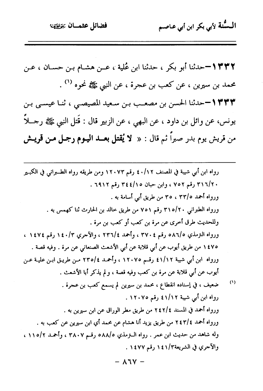 1333 - حَدَّثنا الْحَسَنُ بْنُ مُصْعَبِ بْنِ سَعِيدٍ الْمِصِّيصِيُّ، حَدَّثنا عِيسَى بْنُ يُونُسَ، عَنْ وَائِلِ بْنِ دَاوُدَ، عَنِ الْبَهِيِّ، عَنِ الزُّبَيْرِ قَالَ: قَتَلَ النَّبِيُّ صَلى الله عَلَيهِ وسَلمَ رَجُلاً مِنْ قُرَيْشٍ يَوْمَ بَدْرٍ صَبْرًا، ثُمَّ قَالَ: لاَ يُقْتَلُ بَعْدَ الْيَوْمِ رَجُلٌ مِنْ قُرَيْشٍ صَبْرًا، إِلاَّ رَجُلٌ قَتَلَ عُثْمَانَ, فَاقْتُلُوهُ، فَإِنْ لاَ تَفْعَلُوا, تُقْتَلُوا قَتْلَ الشَّاةِ.