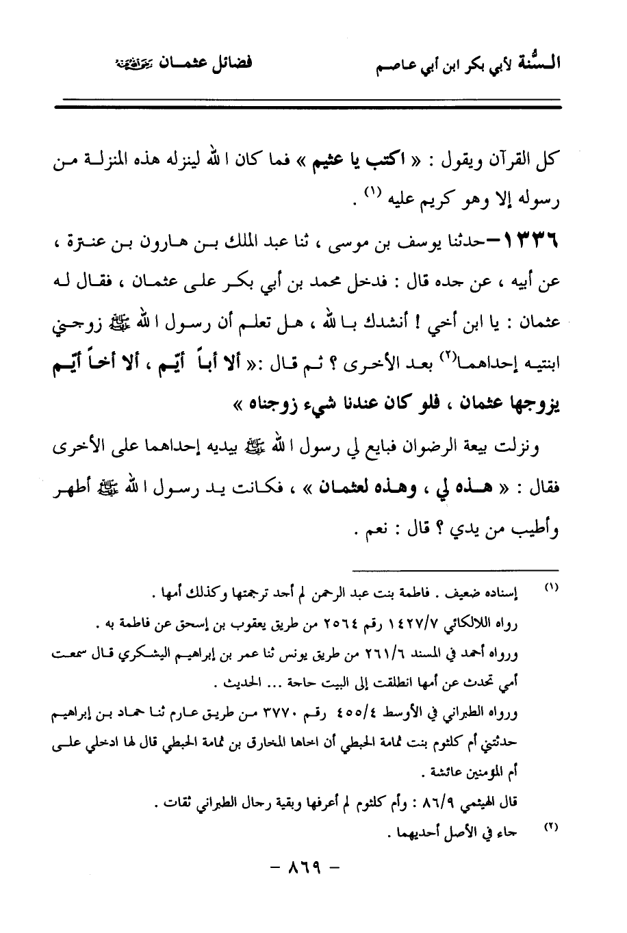 1336 - حَدَّثنا يُوسُفُ بْنُ مُوسَى، حَدَّثنا عَبْدُ الْمَلِكِ بْنُ هَارُونَ بْنِ عَنْتَرَةَ، عَنْ أَبِيهِ، عَنْ جَدِّهِ، قَالَ: فَدَخَلَ مُحَمَّدُ بْنُ أَبِي بَكْرٍ عَلَى عُثْمَانَ، فَقَالَ لَهُ عُثْمَانُ: يَا ابْنَ أَخِي، أَنْشُدُكَ بِاللهِ، هَلْ تَعْلَمُ أَنَّ رَسُولَ اللهِ صَلى الله عَلَيهِ وسَلمَ زَوَّجَنِي ابْنَتَيْهِ, إِحْدَاهُمَا بَعْدَ الأُخْرَى؟ ثُمَّ قَالَ: أَلاَ أَبَا أَيِّمٍ، أَلاَ أَخَا أَيِّمٍ, يُزَوِّجُهَا عُثْمَانَ، فَلَوْ كَانَ عِنْدَنَا شَيْءٌ زَوَّجْنَاهُ، وَنَزَلَتْ بِيعَةُ الرِّضْوَانِ، فَبَايَعَ لِي رَسُولُ اللهِ صَلى الله عَلَيهِ وسَلمَ بِيَدَيْهِ، إِحْدَاهُمَا عَلَى الأُخْرَى، فَقَالَ: هَذِهِ لِي، وَهَذِهِ لِعُثْمَانَ، فَكَانَتْ يَدُ رَسُولِ اللهِ صَلى الله عَلَيهِ وسَلمَ أَطْهَرَ وَأَطْيَبَ مَنْ يَدِي؟ قَالَ: نَعَمْ,