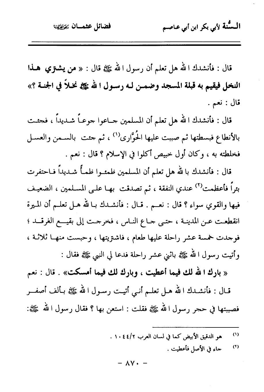 قَالَ: فَأَنْشُدُكَ اللهَ، هَلْ تَعْلَمُ أَنَّ رَسُولَ اللهِ صَلى الله عَلَيهِ وسَلمَ قَالَ: مَنْ يشْتَرِي هَذَا النَّخْلَ، فَيُقِيمَ بِهِ قِبْلَةَ الْمَسْجِدِ، وَضَمِنَ لَهُ رَسُولُ اللهِ صَلى الله عَلَيهِ وسَلمَ نَخْلاً فِي الْجَنَّةِ؟ قَالَ: نَعَمْ, قَالَ: فَأَنْشُدُكَ اللهَ، هَلْ تَعْلَمُ أَنَّ الْمُسْلِمِينَ جَاعُوا جُوعًا شَدِيدًا، فَجِئْتُ بِالأَنْطَاعِ، فَبَسَطْتُهَا، ثُمَّ صَبَبْتُ عَلَيْهَا الْحُوَّارَى، ثُمَّ جِئْتُ بِالسَّمْنِ وَالْعَسَلِ، فَخَلَطْتُهُ بِهِ، وَكَانَ أَوَّلَ خَبِيصٍ أَكَلُوا فِي الإِسْلاَمِ؟ قَالَ: نَعَمْ, قَالَ: فَأَنْشُدُكَ بِاللهِ، هَلْ تَعْلَمُ أَنَّ الْمُسْلِمِينَ ظَمِئُوا ظَمَأً شَدِيدًا، فَاحْتَفَرْتُ بِئْرًا، فَأَعْظَمَت عِنْدِي النَّفَقَةَ، ثُمَّ تَصَدَّقْتُ بِهَا عَلَى الْمُسْلِمِينَ، الضَّعِيفُ فِيهَا وَالْقَوِيُّ سَوَاءٌ؟ قَالَ: نَعَمْ, قَالَ: فَأَنْشُدُكَ بِاللهِ، هَلْ تَعْلَمُ أَنَّ الْمِيَرَةَ انْقَطَعَتْ عَنِ الْمَدِينَةِ, حَتَّى جَاعَ النَّاسُ، فَخَرَجْتُ إِلَى بَقِيعِ الْغَرْقَدِ، فَوَجَدْتُ خَمْسَةَ عَشَرَ رَاحِلَةً عَلَيْهَا طَعَامٌ، فَاشْتَرَيْتُهَا, وَحَبَسْتُ مِنْهَا ثَلاَثَةً، وَأَتَيْتُ رَسُولَ اللهِ صَلى الله عَلَيهِ وسَلمَ بِاثْنَي عَشْرَ رَاحِلَةً، فَدَعَا لِيَ النَّبِيُّ صَلى الله عَلَيهِ وسَلمَ, فَقَالَ: بَارَكَ اللهُ لَكَ فِيمَا أَعْطَيْتَ، وَبَارَكَ لَكَ فِيمَا أَمْسَكْتَ، قَالَ: نَعَمْ,