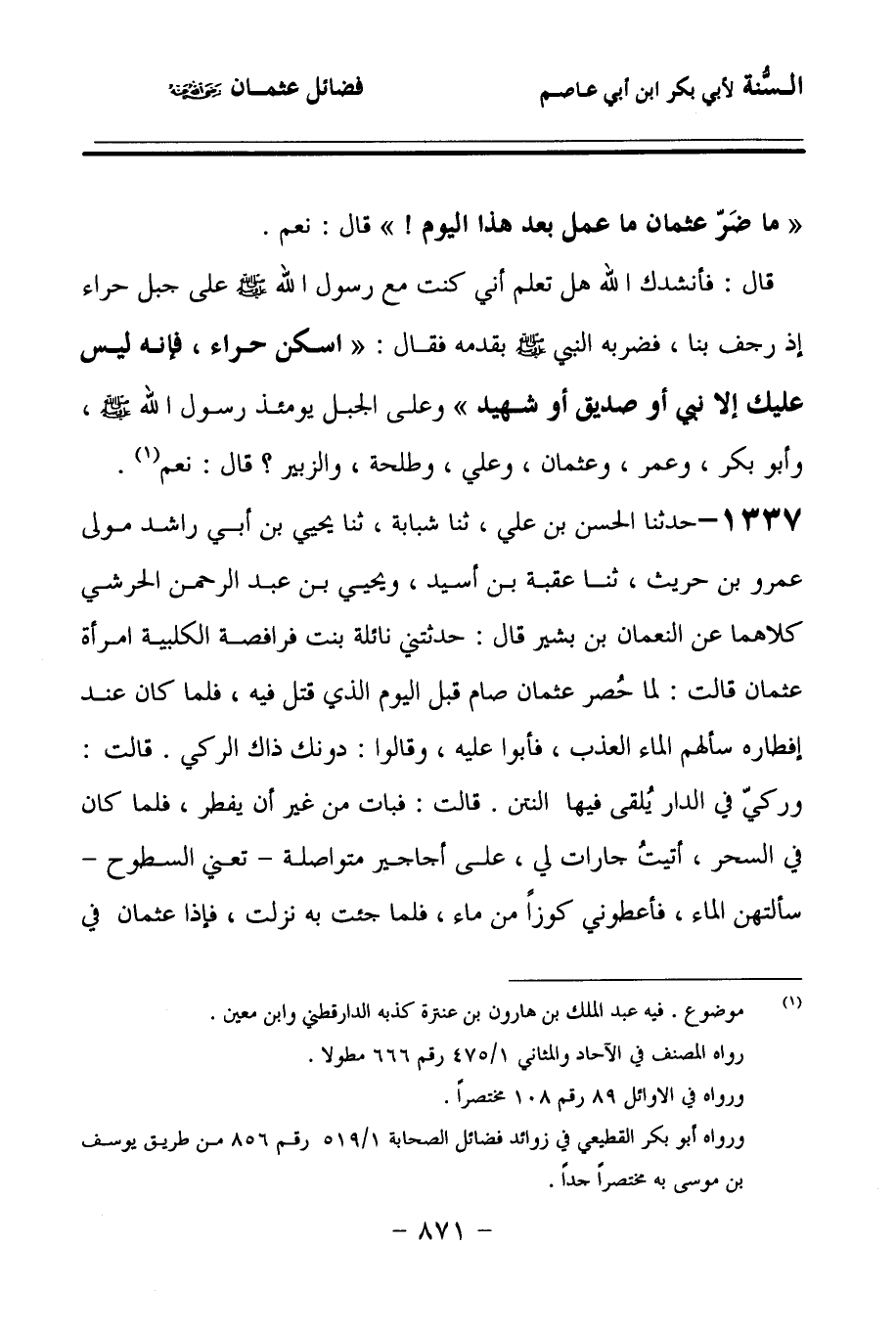 1337 - حَدَّثنا الْحَسَنُ بْنُ عَلِيٍّ، حَدَّثنا شَبَابَةُ، حَدَّثنا يَحْيَى بْنُ أَبِي رَاشِدٍ, مَوْلَى عَمْرِو بْنِ حُرَيْثٍ، حَدَّثنا عُقْبَةُ بْنُ أُسَيْدٍ، وَيَحْيَى بْنُ عَبْدِ الرَّحْمَنِ الْحَرَشِيُّ، كِلاَهُمَا عَنِ النُّعْمَانِ بْنِ بَشِيرٍ، قَالَ: حَدَّثَتْنِي نَائِلَةُ بِنْتُ فُرَافِصَةَ الْكَلْبِيَّةُ، امْرَأَةُ عُثْمَانَ، قَالَتْ: لَمَّا حُصِرَ عُثْمَانُ, صَامَ قَبْلَ الْيَوْمِ الَّذِي قُتِلَ فِيهِ، فَلَمَّا كَانَ عِنْدَ إِفْطَارِهِ, سَأَلَهُمُ الْمَاءَ الْعَذْبَ، فَأَبَوْا عَلَيْهِ, وَقَالُوا: دُونَكَ ذَاكَ الرَّكِيُّ، قَالَتْ: وَرَكِيٌّ فِي الدَّارِ يُلْقَى فِيهَا النَّتَنُ، قَالَتْ: فَبَاتَ مِنْ غَيْرِ أَنْ يُفْطِرَ، فَلَمَّا كَانَ فِي السَّحَرِ، أَتَيْتُ جَارَاتٍ لِي عَلَى أَجَاجِيرَ مُتَوَاصِلَةٍ, تَعْنِي السُّطُوحَ، سَأَلْتُهُنَّ الْمَاءَ، فَأَعْطَوْنِي كُوزًا مِنْ مَاءٍ، فَلَمَّا جِئْتُ بِهِ نَزَلْتُ, فَإِذَا عُثْمَانُ فِي أَسْفَلِ الدَّرَجَةِ نَائِمًا يَغِطُّ، فَأَيْقَظْتُهُ، قَالَتْ: هَذَا مَاءٌ عَذْبٌ أَتَيْتُكَ بِهِ، قَالَتْ: فَرَفَعَ رَأْسَهُ يَنْظُرُ إِلَى الْفَجْرِ، فَقَالَ: إِنِّي أَصْبَحْتُ صَائِمًا، فَقُلْتُ: مِنْ أَيْنَ, وَلَمْ أَرَ أَحَدًا أَتَاكَ بِطَعَامٍ وَلاَ شَرَابٍ؟ فَقَالَ: إِنَّ رَسُولَ اللهِ صَلى الله عَلَيهِ وسَلمَ اطَّلَعَ عَلَيَّ مِنْ هَذَا السَّقْفِ وَمَعَهُ دَلْوٌ مِنْ مَاءٍ، فَقَالَ: اشْرَبْ يَا عُثْمَانُ، فَشَرِبْتُ, حَتَّى رَوِيتُ، ثُمَّ قَالَ: ازْدَدْ، فَشَرِبْتُ, حَتَّى رَوِيتُ، ثُمَّ قَالَ: أَمَا إِنَّ الْقَوْمَ سَيَكْثُرُونَ عَلَيْكَ، فَإِنْ قَاتَلْتَهُمْ ظَفِرْتَ، وَإِنْ تَرَكْتَهُمْ أَفْطَرْتَ عِنْدَنَا، فَدَخَلُوا عَلَيْهِ مِنْ يوْمِهِ, فَقَتَلُوهُ.