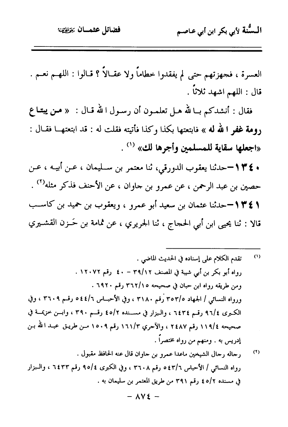 قَالَ: فَأَنْشُدُكُمْ بِاللهِ الَّذِي لاَ إِلَهَ إِلاَّ هُوَ، أَتَعْلَمُونَ أَنَّ رَسُولَ اللهِ صَلى الله عَلَيهِ وسَلمَ نَظَرَ فِي وجُوهِ الْقَوْمِ, فَقَالَ: مَنْ جَهَّزَ هَؤُلاَءِ غَفَرَ اللهُ لَهُ, يَعْنِي جَيْشَ الْعُسْرَةِ، فَجَهَّزْتُهُمْ, حَتَّى لَمْ يَفْقِدُوا خِطَامًا وَلاَ عِقالاً؟ قَالُوا: اللهُمَّ نَعَمْ، قَالَ: اللهُمَّ اشْهَدْ، ثَلاَثًا, فَقَالَ: أَنْشُدُكُمْ هَلْ تَعْلَمُونَ أَنَّ رَسُولَ اللهِ صَلى الله عَلَيهِ وسَلمَ قَالَ: مَنْ يبْتَاع رُومَةَ, غَفَرَ اللهُ لَهُ، فَابْتَعْتُهَا بِكَذَا وَكَذَا, فَأَتَيْتُهُ, فَقُلْتُ لَهُ: قَدِ ابْتَعْتُهَا، فَقَالَ: اجْعَلْهَا سِقَايَةً لِلْمُسْلِمِينَ وَأَجْرُهَا لَكَ.