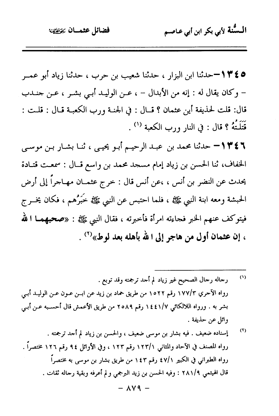 1346 - حَدَّثنا مُحَمَّدُ بْنُ عَبْدِ الرَّحِيمِ, أَبُو يَحْيَى، حَدَّثنا بَشَّارُ بْنُ مُوسَى الْخِفَافُ، حَدَّثنا الْحَسَنُ بْنُ زِيَادٍ, إِمَامُ مَسْجِدِ مُحَمَّدِ بْنِ وَاسِعٍ، قَالَ: سَمِعْتُ قَتَادَةَ يُحَدِّثُ عَنِ النَّضْرِ بْنِ أَنَسٍ، عَنْ أَنَسٍ، قَالَ: خَرَجَ عُثْمَانُ مُهَاجِرًا إِلَى أَرْضِ الْحَبَشَةِ, وَمَعَهُ ابْنَةُ النَّبِيِّ صَلى الله عَلَيهِ وسَلمَ، فَلَمَّا احْتَبَسَ عَنِ النَّبِيِّ صَلى الله عَلَيهِ وسَلمَ خَبَرُهُمْ، فَكَانَ يَخْرُجُ فَيَتَوَكَّفُ عَنْهُمُ الْخَبَرَ، فَجَاءَتْهُ امْرَأَةٌ فَأَخْبَرَتْهُ، فَقَالَ النَّبِيُّ صَلى الله عَلَيهِ وسَلمَ: صَحِبَهُمَا اللهُ، إِنَّ عُثْمَانَ أَوَّلُ مَنْ هَاجَرَ إِلَى اللهِ بِأَهْلِهِ بَعْدَ لُوطٍ.