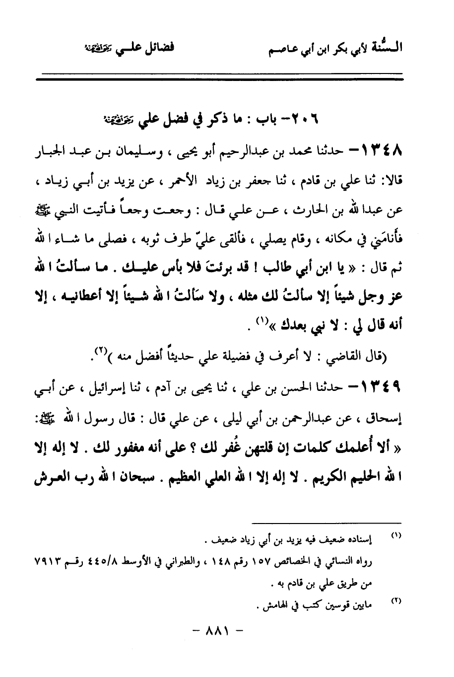 1349 - حَدَّثنا الْحَسَنُ بْنُ عَلِيٍّ، حَدَّثنا يَحْيَى بْنُ آدَمَ، حَدَّثنا إِسْرَائِيلُ، عَنْ أَبِي إِسْحَاقَ، عَنْ عَبْدِ الرَّحْمَنِ بْنِ أَبِي لَيْلَى، عَنْ عَلِيٍّ، قَالَ: قَالَ رَسُولُ اللهِ صَلى الله عَلَيهِ وسَلمَ: أَلاَ أُعَلِّمُكَ كَلِمَاتٍ إِنْ قُلْتَهُنَّ غُفِرَ لَكَ، عَلَى أَنَّهُ مَغْفُورٌ لَكَ؟ لاَ إِلَهَ إِلاَّ اللهُ الْحَلِيمُ الْكَرِيمُ، لاَ إِلَهَ إِلاَّ اللهُ الْعَلِيُّ الْعَظِيمُ، سُبْحَانَ اللهِ رَبِّ الْعَرْشِ الْعَظِيمِ، الْحَمْدُ لِلَّهِ رَبِّ الْعَالَمِينَ.