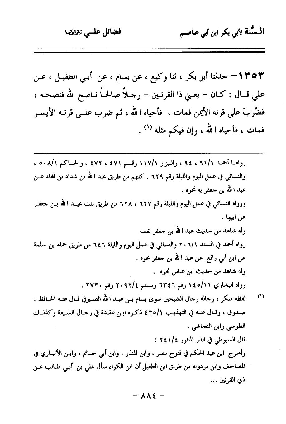 1353 - حَدَّثنا أَبُو بَكْرٍ، حَدَّثنا وَكِيعٌ، عَنْ بَسَّامٍ، عَنْ أَبِي الطُّفَيْلِ، عَنْ عَلِيٍّ، قَالَ: كَانَ، يَعْنِي ذَا الْقَرْنَيْنِ، رَجُلاً صَالِحًا, نَاصِحٌ للهِ فَنَصَحَهُ، فَضَرَبَ عَلَى قَرْنِهِ الأَيْمَنِ, فَمَاتَ، فَأَحْيَاهُ اللهُ، ثُمَّ ضَرَبَ عَلَى قَرْنِهِ الأَيْسَرِ, فَمَاتَ، فَأَحْيَاهُ اللهُ، وَإِنَّ فِيكُمْ مِثْلَهُ.