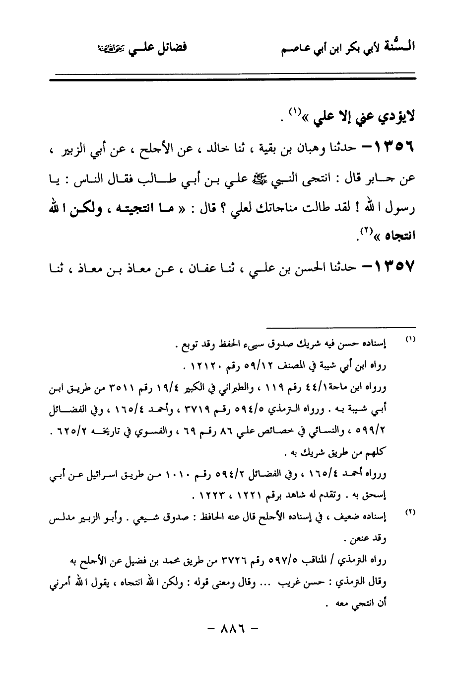 1356 - حَدَّثنا وَهْبَان بْنُ بَقِيَّةَ، حَدَّثنا خَالِدٌ، عَنِ الأَجْلَحِ، عَنْ أَبِي الزُّبَيْرِ، عَنْ جَابِرٍ، قَالَ: انْتَجَى النَّبِيُّ صَلى الله عَلَيهِ وسَلمَ عَلِيَّ بْنَ أَبِي طَالِبٍ، فَقَالَ النَّاسُ: يَا رَسُولَ اللهِ, لَقَدْ طَالَتْ مُنَاجَاتُكَ لِعَلِيٍّ، قَالَ: مَا انْتَجَيْتُهُ، وَلَكِنَّ اللهَ انْتَجَاهُ.