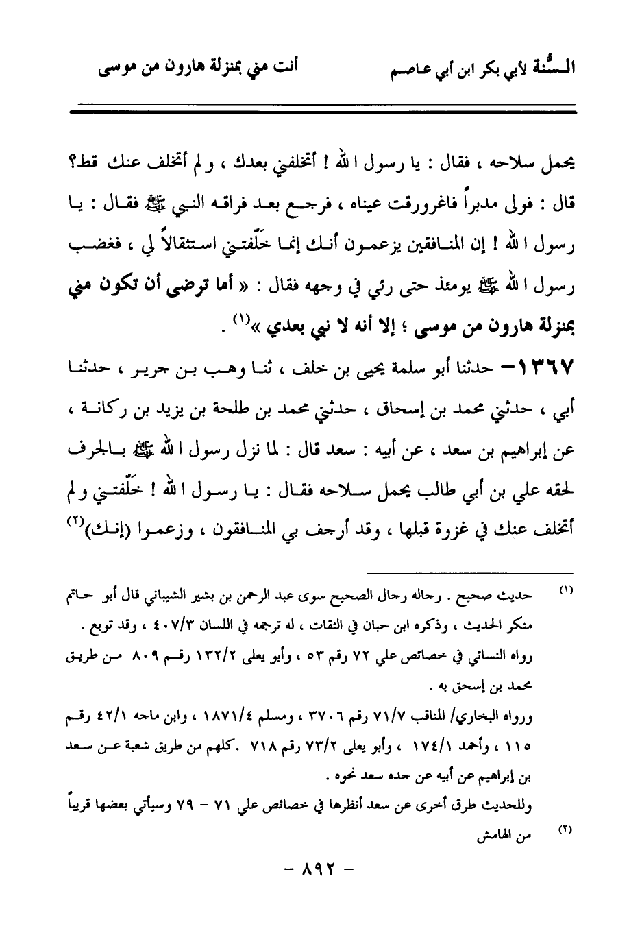 1367 - حَدَّثنا أَبُو سَلَمَةَ يَحْيَى بْنُ خَلَفٍ، حَدَّثنا وَهْبُ بْنُ جَرِيرٍ، حَدَّثنا أَبِي، حَدَّثَنِي مُحَمَّدُ بْنُ إِسْحَاقَ، حَدَّثَنِي مُحَمَّدُ بْنُ طَلْحَةَ بْنِ يَزِيدَ بْنِ رُكَانَةَ، عَنْ إِبْرَاهِيمَ بْنِ سَعْدٍ، عَنْ أَبِيهِ سَعْدٍ، قَالَ: لَمَّا نَزَلَ رَسُولُ اللهِ صَلى الله عَلَيهِ وسَلمَ بِالْجُرُفِ، لَحِقَهُ عَلِيُّ بْنُ أَبِي طَالِبٍ يَحْمِلُ سِلاَحَهُ، فَقَالَ: يَا رَسُولَ اللهِ, خَلَّفْتَنِي وَلَمْ أَتَخَلَّفْ عَنْكَ فِي غَزْوَةٍ قَبْلَهَا، وَقَدِ أَرْجَفَ بِيَ الْمُنَافِقُونَ، وَزَعَمُوا أَنَّكَ إِنَّمَا خَلَّفْتَنِي, أَنَّكَ اسْتَثْقَلْتَنِي، قَالَ سَعْدٌ: فَسَمِعْتُ رَسُولَ اللهِ صَلى الله عَلَيهِ وسَلمَ يَقُولُ: أَلاَ تَرْضَى يَا عَلِيُّ أَنْ تَكُونَ مِنِّي بِمَنْزِلَةِ هَارُونَ مِنْ مُوسَى، إِلاَّ أَنَّهُ لاَ نَبِيَّ بَعْدِي؟ فَارْجِعْ, فَاخْلُفْنِي فِي أَهْلِي وَأَهْلِكَ.