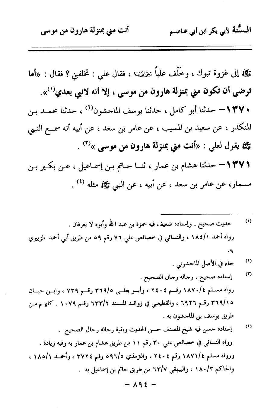 1370 - حَدَّثنا أَبُو كَامِلٍ, حَدَّثنا يُوسُفُ الْمَاجِشُونَ، حَدَّثنا مُحَمَّدُ بْنُ الْمُنْكَدِرِ، عَنْ سَعِيدِ بْنِ الْمُسَيِّبِ، عَنْ عَامِرِ بْنِ سَعْدٍ، عَنْ أَبِيهِ، أَنَّهُ سَمِعَ النَّبِيَّ صَلى الله عَلَيهِ وسَلمَ يَقُولُ لِعَلِيٍّ: أَنْتَ مِنِّي بِمَنْزِلَةِ هَارُونَ مِنْ مُوسَى.