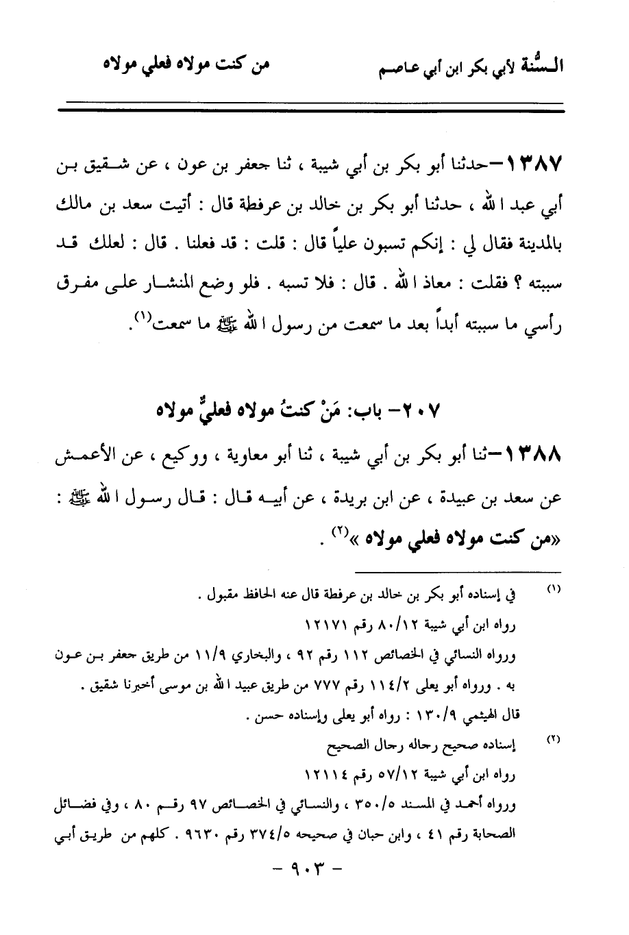 1388 - حَدَّثنا أَبُو بَكْرِ بْنُ أَبِي شَيْبَةَ، حَدَّثنا أَبُو مُعَاوِيَةَ، وَوَكِيعٌ، عَنِ الأَعْمَشِ، عَنْ سَعْدِ بْنِ عُبَيْدَةَ، عَنِ ابْنِ بُرَيْدَةَ، عَنْ أَبِيهِ، قَالَ: قَالَ رَسُولُ اللهِ صَلى الله عَلَيهِ وسَلمَ: مَنْ كُنْتُ مَوْلاَهُ, فَعَلِيٌّ مَوْلاَهُ.