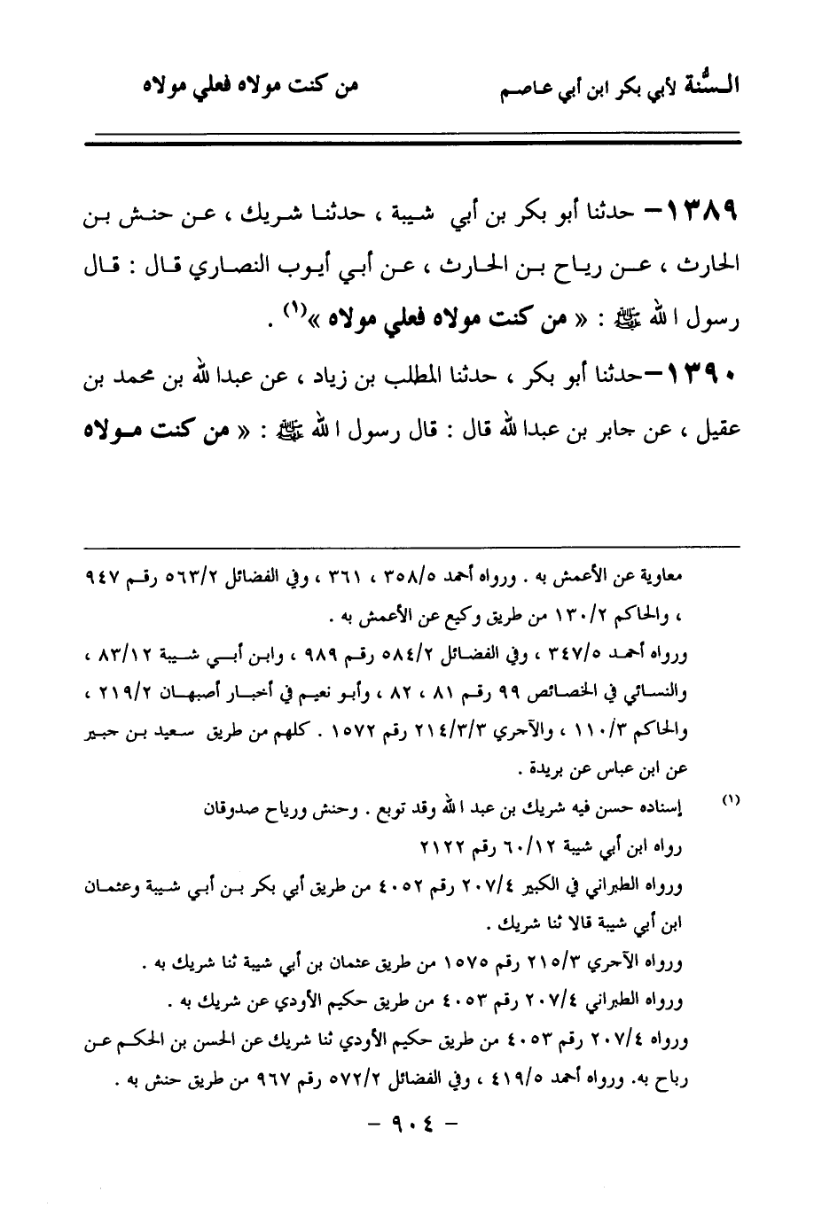 1389 - حَدَّثنا أَبُو بَكْرِ بْنُ أَبِي شَيْبَةَ، حَدَّثنا شَرِيكٌ، عَنْ حَنَشِ بْنِ الْحَارِثِ، عَنْ رِيَاحِ بْنِ الْحَارِثِ، عَنْ أَبِي أَيُّوبَ الأَنْصَارِيِّ، قَالَ: قَالَ رَسُولُ اللهِ صَلى الله عَلَيهِ وسَلمَ: مَنْ كُنْتُ مَوْلاَهُ فَعَلِيٌّ مَوْلاَهُ.